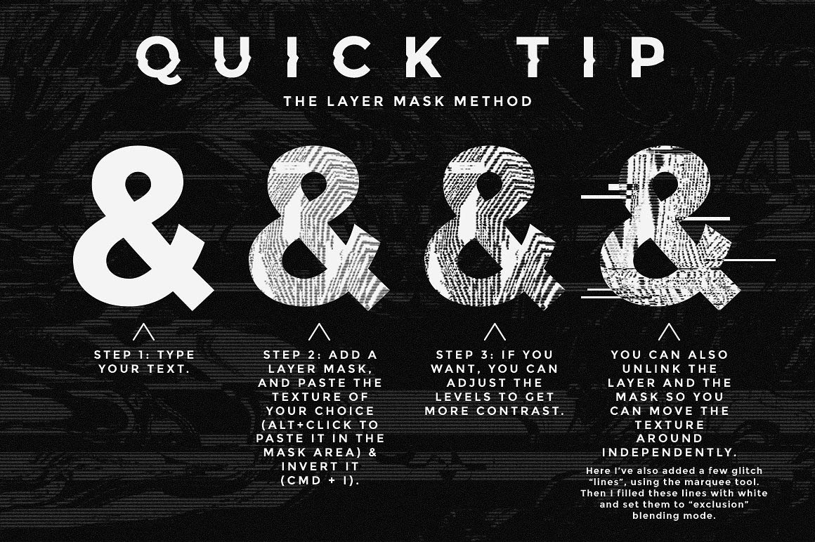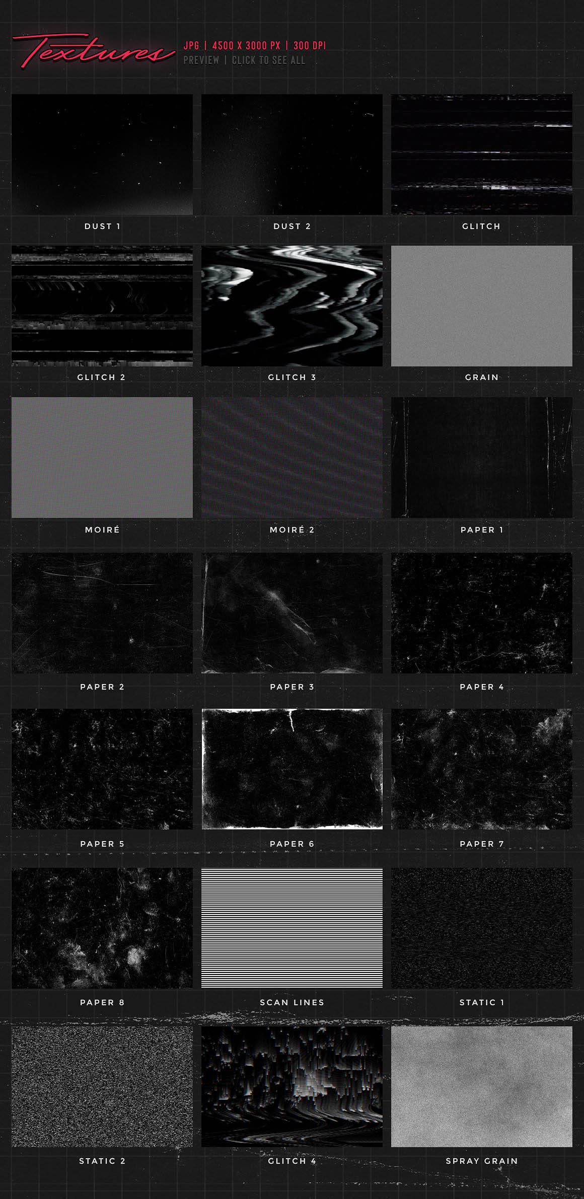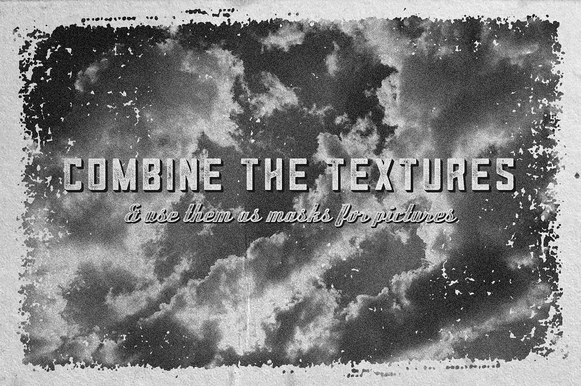 ► These textures work great as backgrounds, or as masks to add texture to your texts, logos and other designs. They can be combined for custom results.