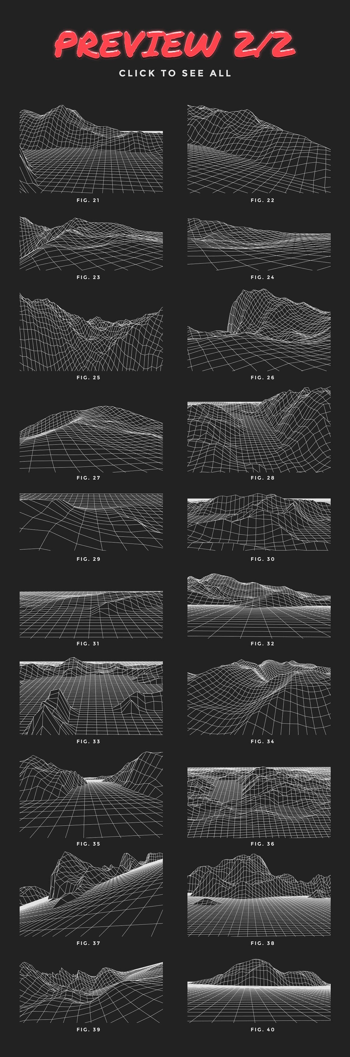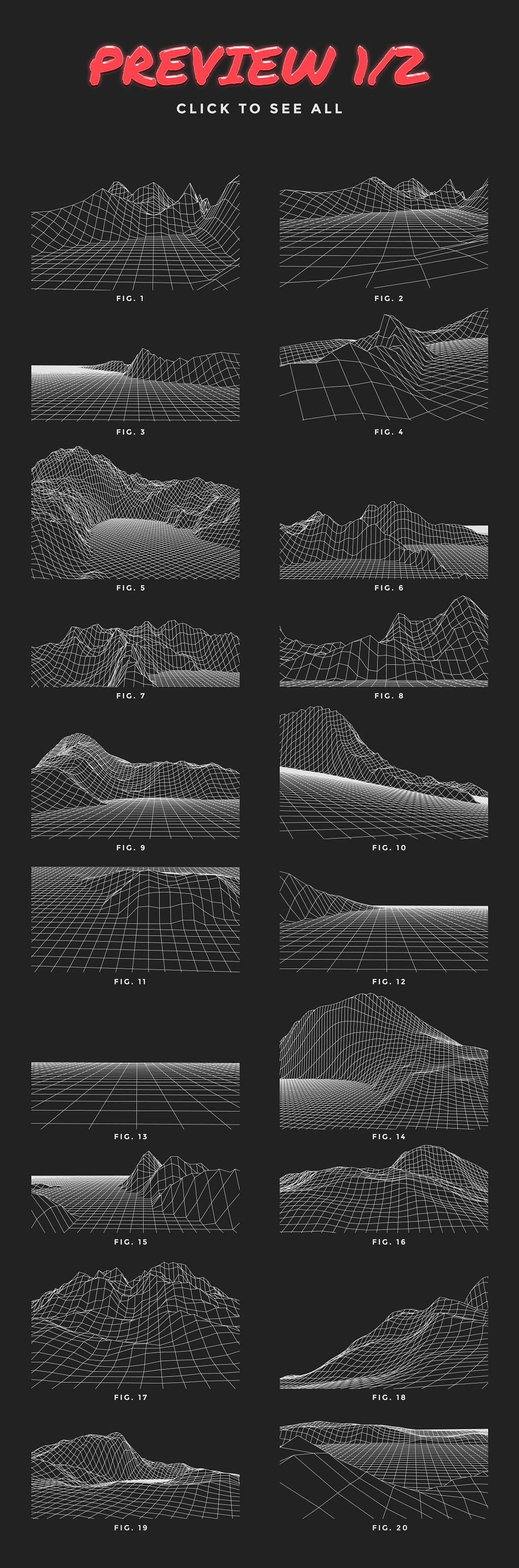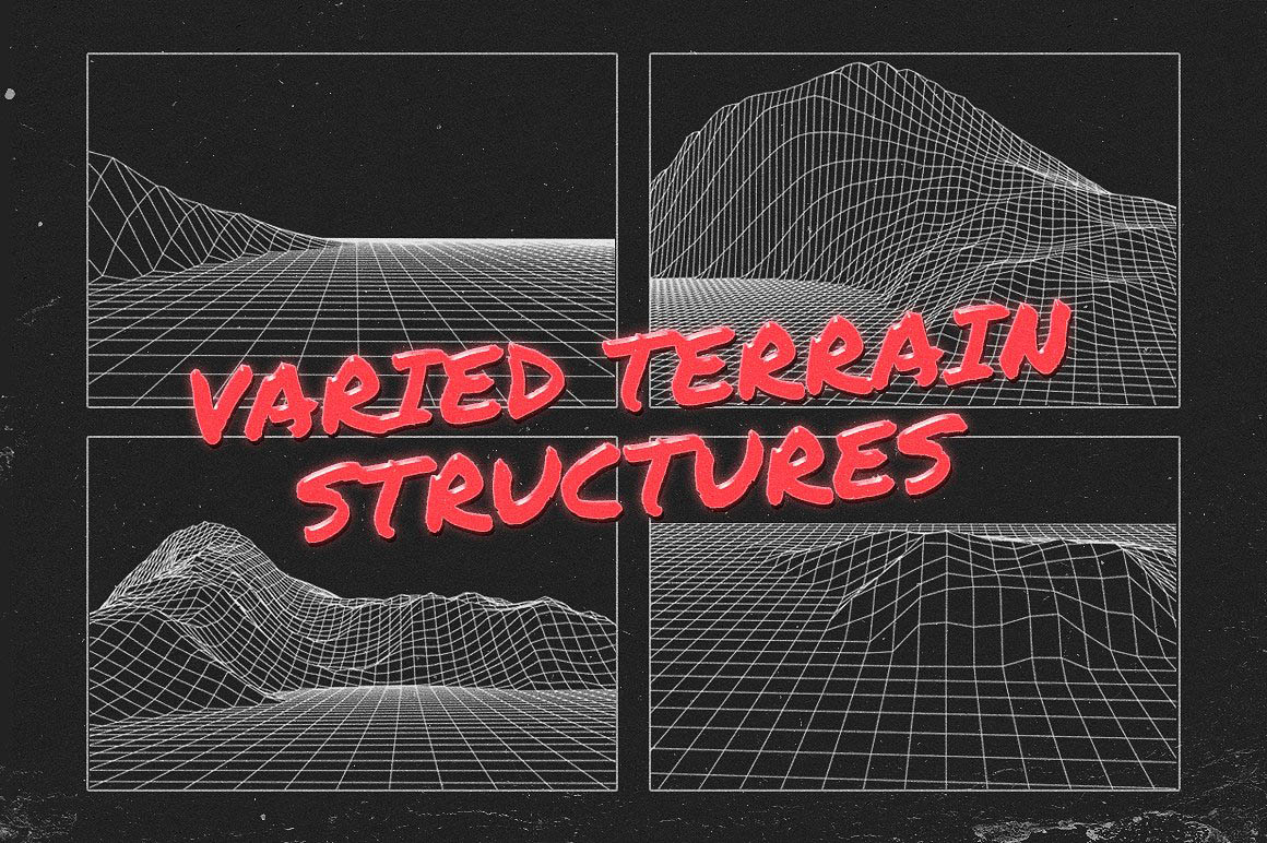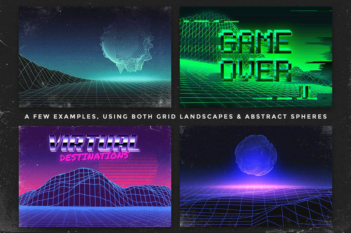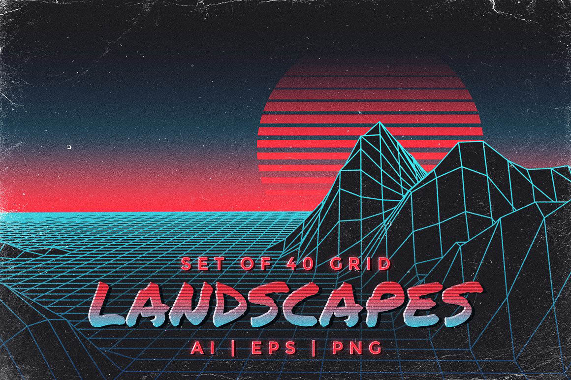 • A set of 40 vector grid landscapes inspired by retro futuristic/80’s aesthetics.