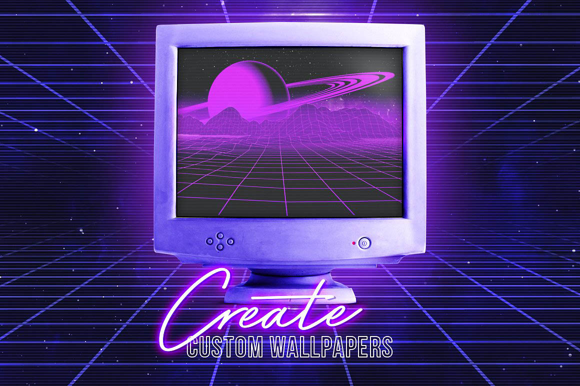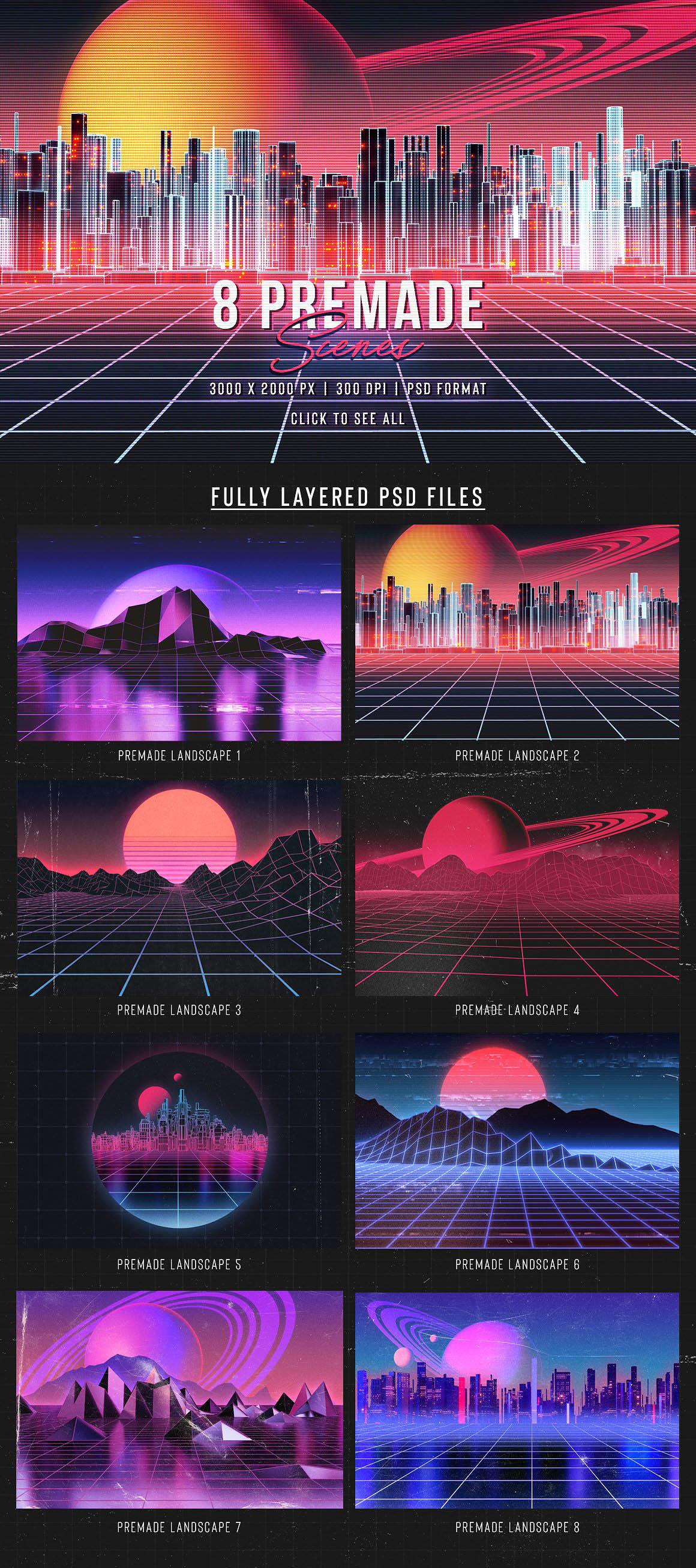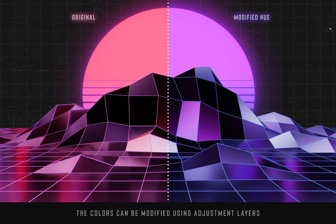 - A large variety of objects to create your own 80’s inspired landscapes: choose between two different styles of 80’s grid landscapes (simple or glossy), as well as suns and planets, skylines and more. (See preview images for an overview of all the elements included in the kit, along with their dimensions in pixels).