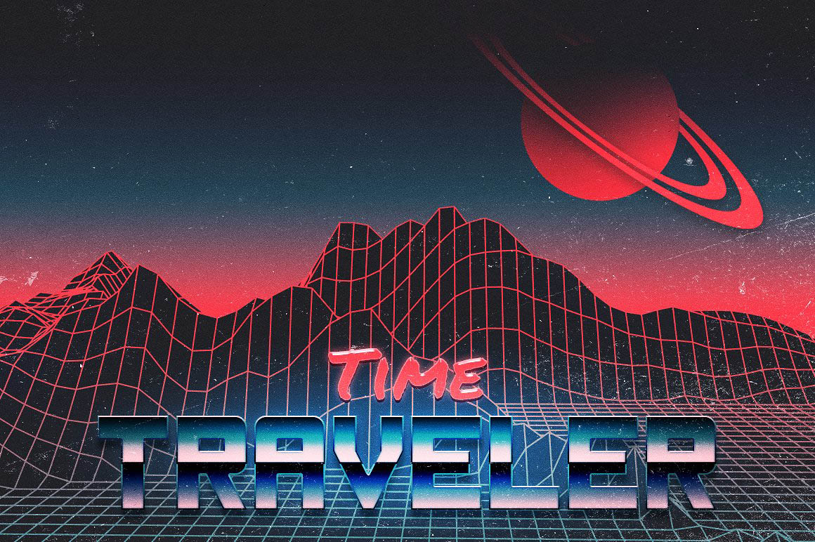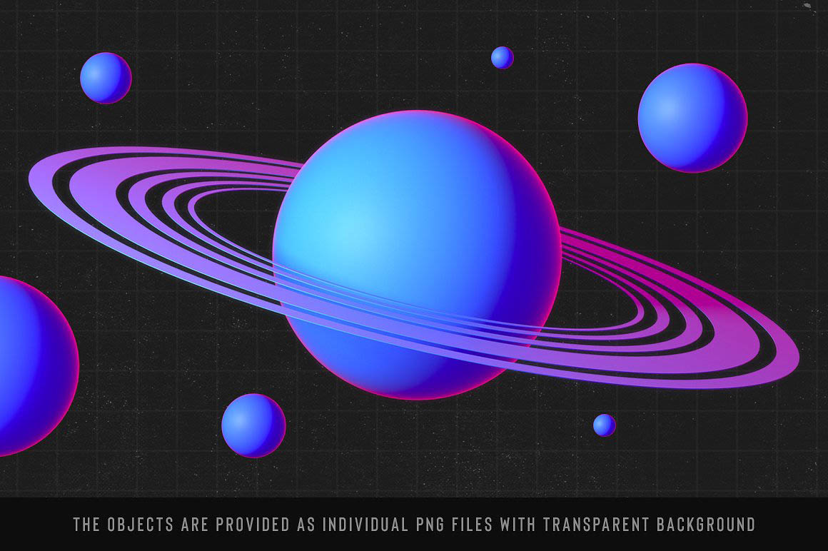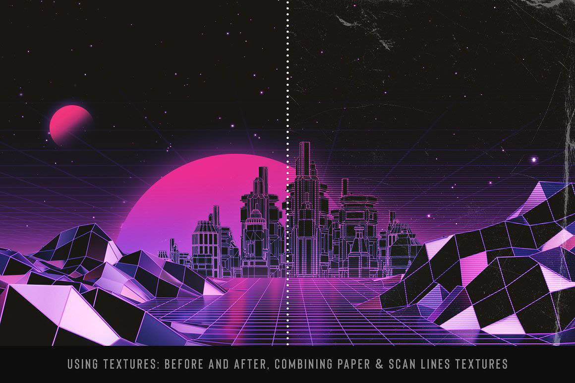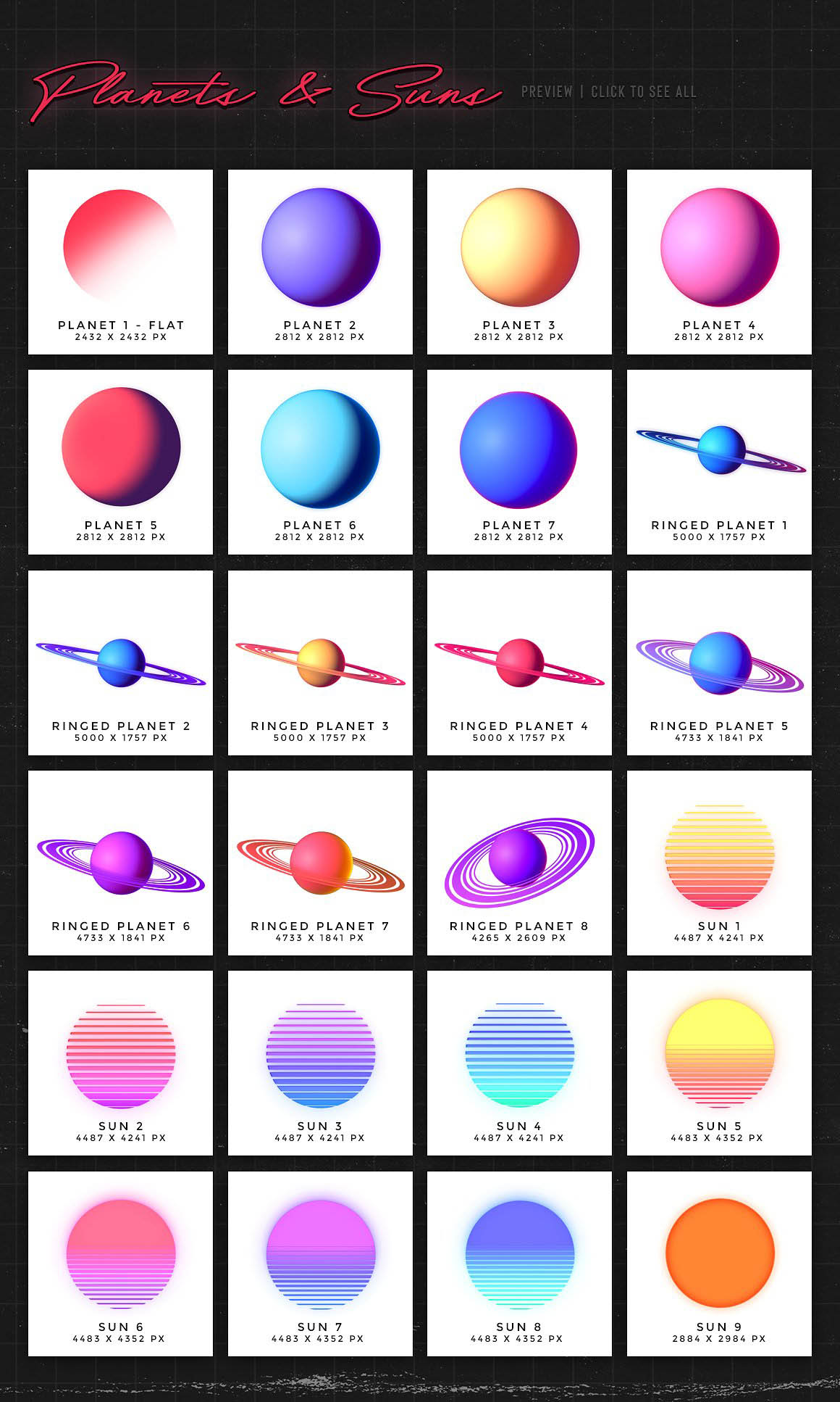 - A large variety of objects to create your own 80’s inspired landscapes: choose between two different styles of 80’s grid landscapes (simple or glossy), as well as suns and planets, skylines and more. (See preview images for an overview of all the elements included in the kit, along with their dimensions in pixels).