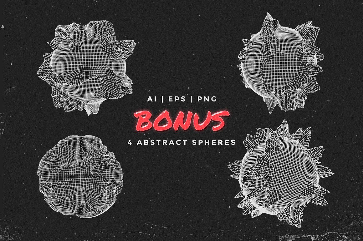 • 4 Bonus abstract spheres (available in AI, EPS and PNG) PNG dimensions: 4000 x 4000 px, 300 DPI
