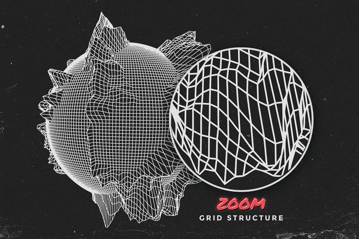 - Base grids: these are great for creating the classic look of a grid disappearing into the horizon. There are also a few grids viewed from the front, which can be used as backgrounds.