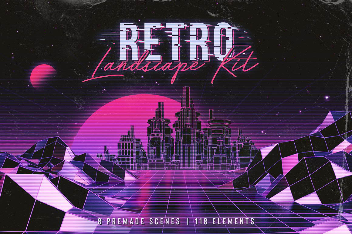 Create your own retro/80’s inspired landscape scenes with this kit! It includes a lot of different elements, objects, textures and backgrounds, as well as 8 premade scenes. This set works great for creating 80’s inspired compositions, CD or book covers, wallpapers, and more.