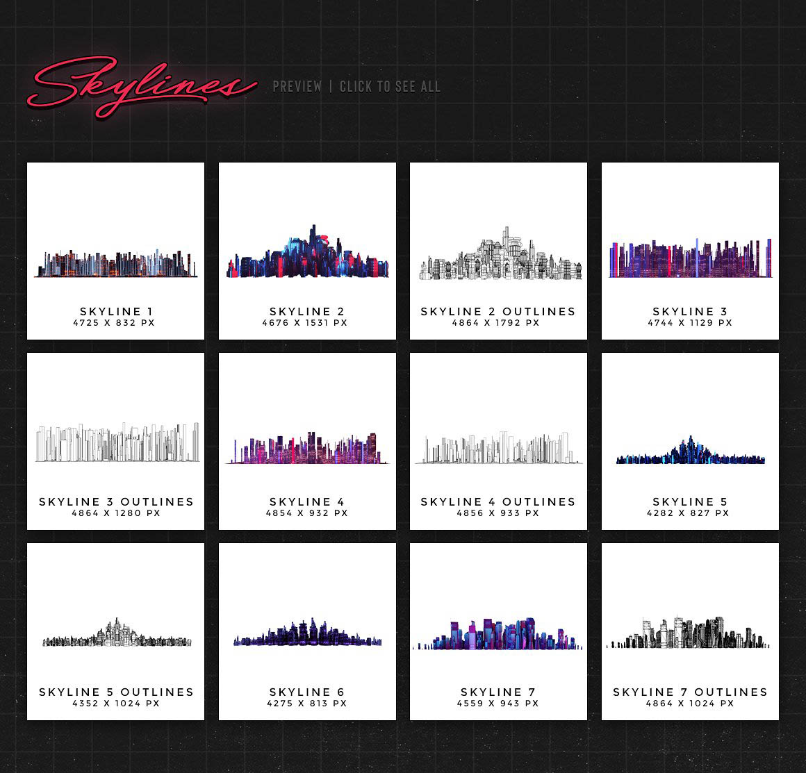 - Skylines: like the mountains silhouettes, they work great as background elements, combined with a simple “infinite grid” at the front, or one of the grid landscape elements.