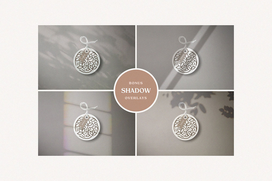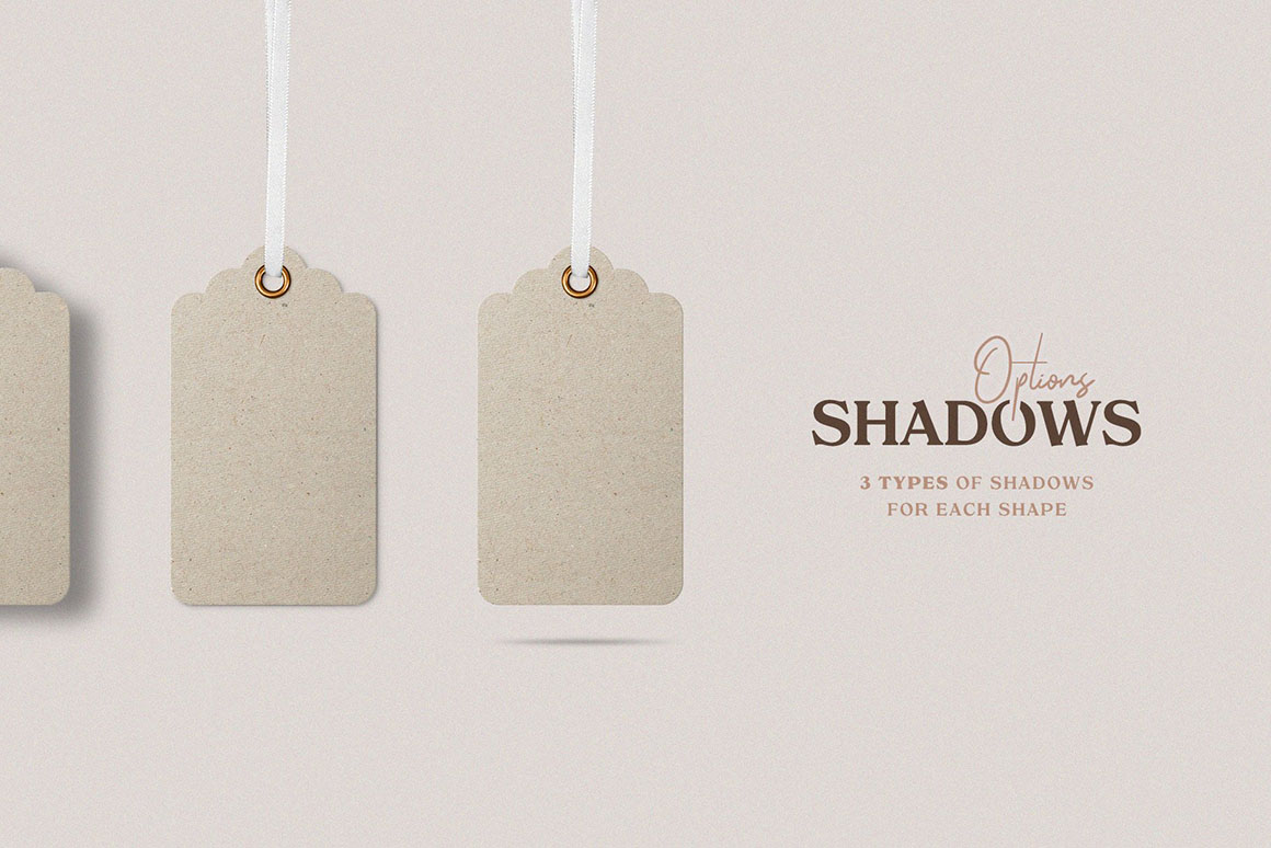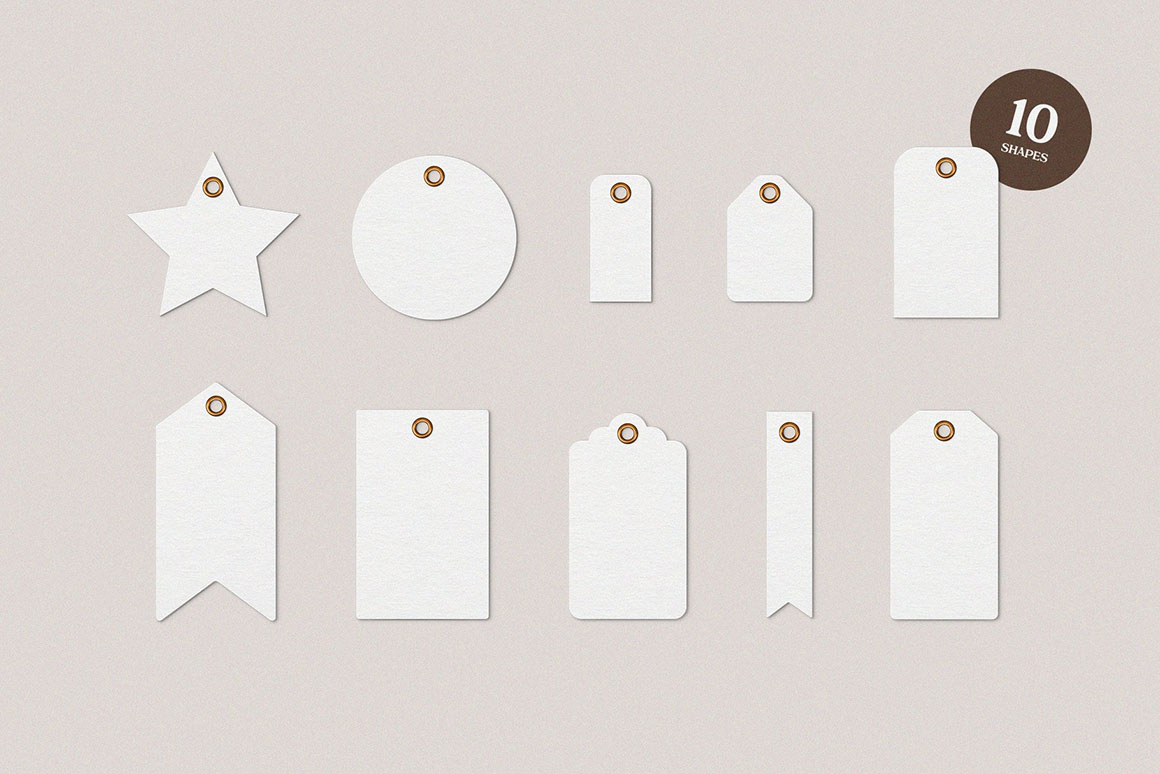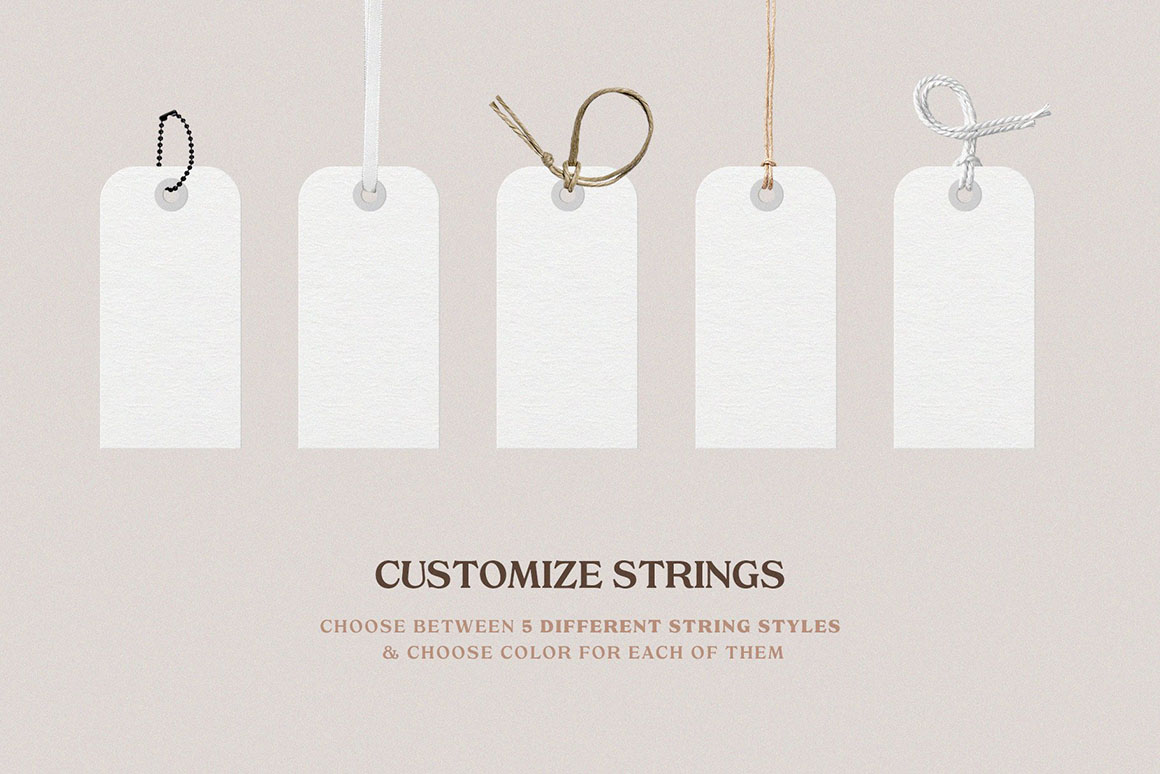 - 10 tag shapes, 5 string variants, 3 tag shadow options, customizable eyelets (metalic and paper), 4 overlay shadows, 4 premade scenes, 8 different backgrounds.