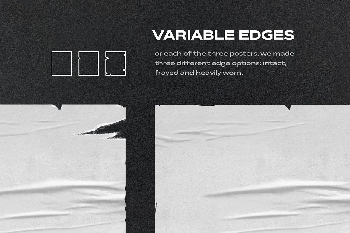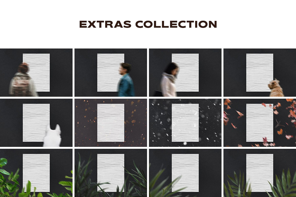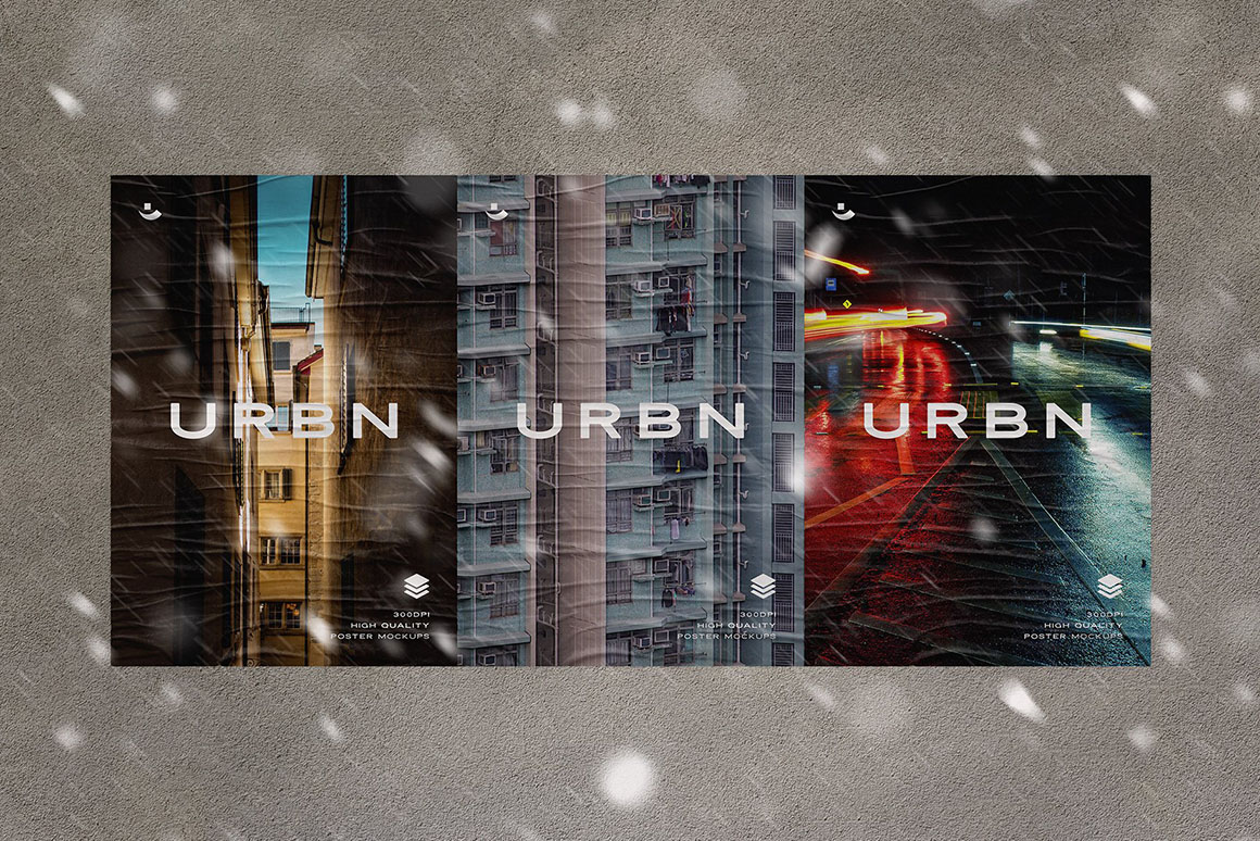 We’ve managed to include many curious tools you’re about to discover and make them your personal favorites for any project! But first things first, let us tell you more. There are 3 types of poster texturing for you to decide on the intensity of glue and 3 different edge options to achieve the intact, frayed or heavy worn effect. The perfection isn’t quite without realistic 12 shadow overlays, adding the aesthetics of natural sunlight dropping artistic shadows. At last, finish your composition with additional elements from extras collection: snow, people passing by, dogs, greenery and other. Work on unforgettable presentations, commercial projects, visual identities, or just inspiring pieces of art, created with such abiding love to realism and details!