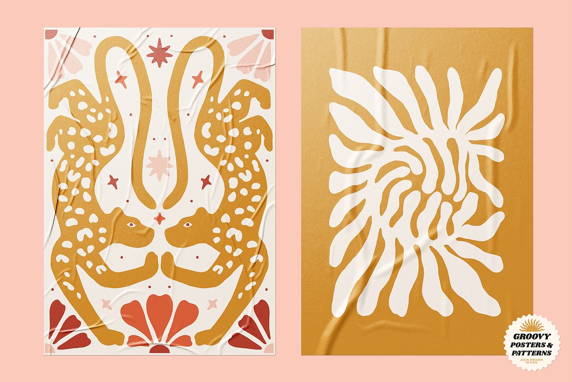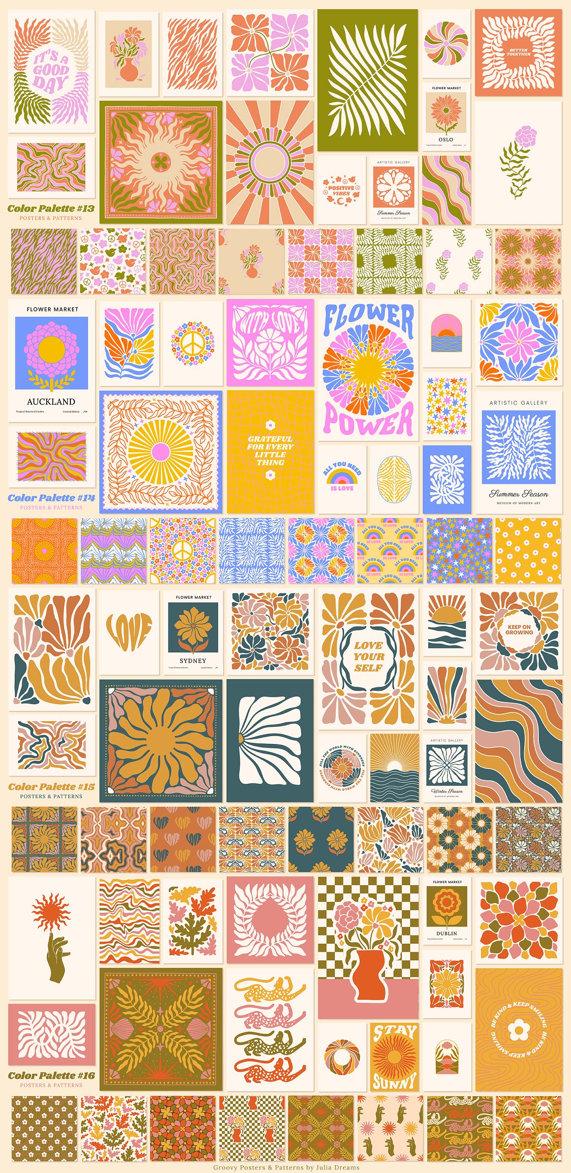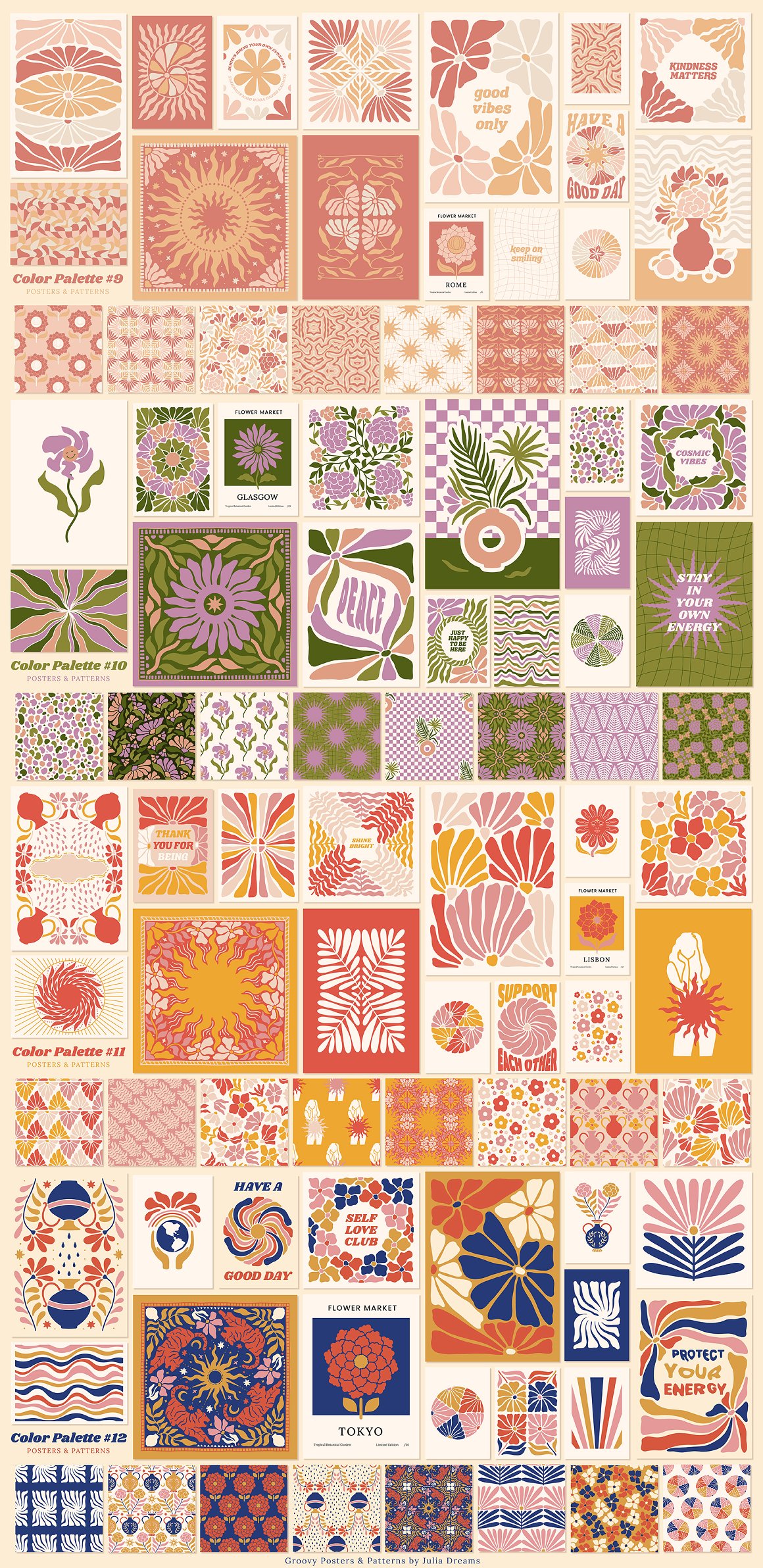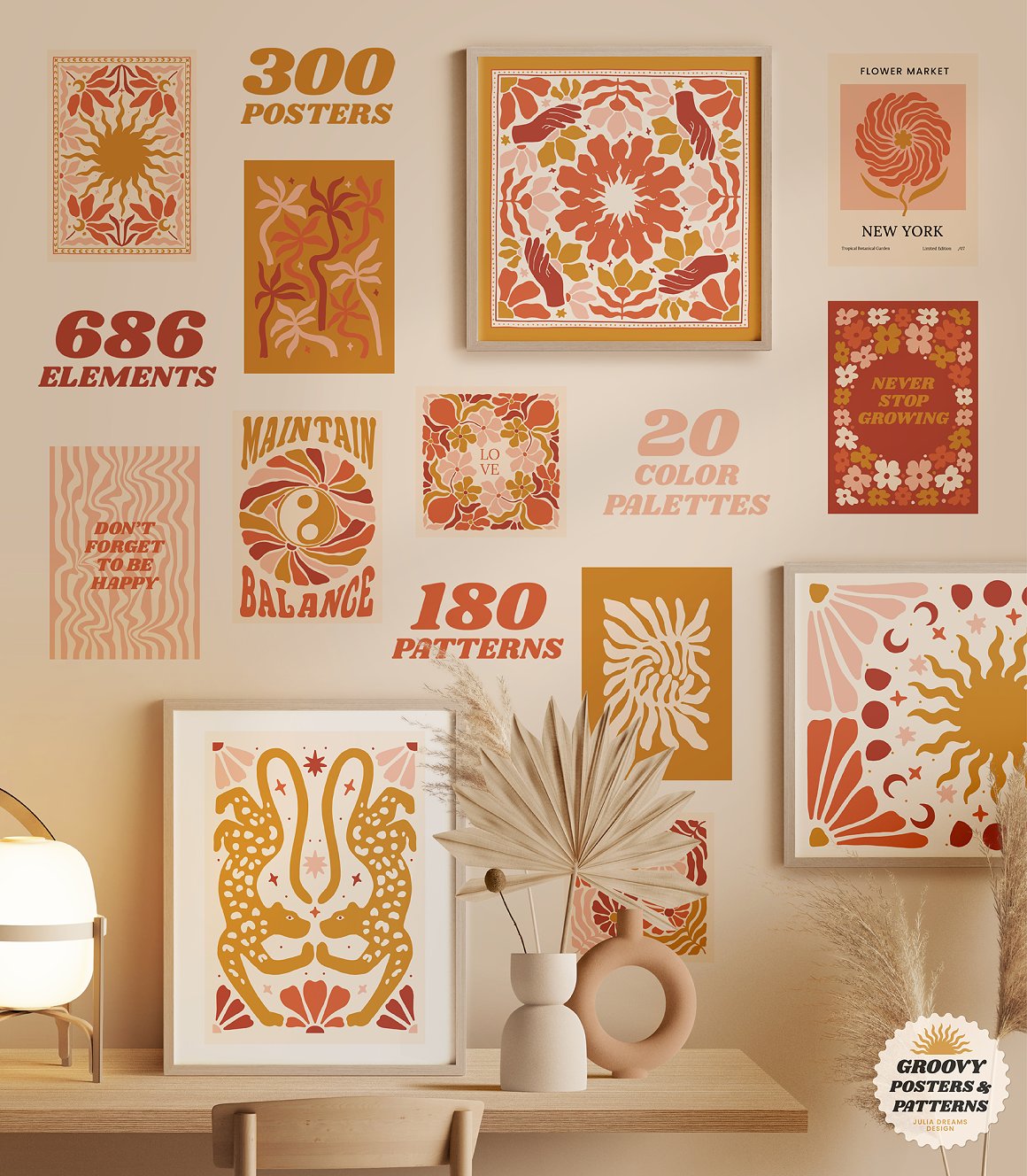 Groovy Posters and Patterns Bundle great for wedding invites, wall art prints, greeting cards, gifts, logo, posters, cards, branding, planners, covers, social media accounts, wrapping paper, wallpaper, fabric, scrapbooking, stickers, sites, blogs, invitations and for many more.