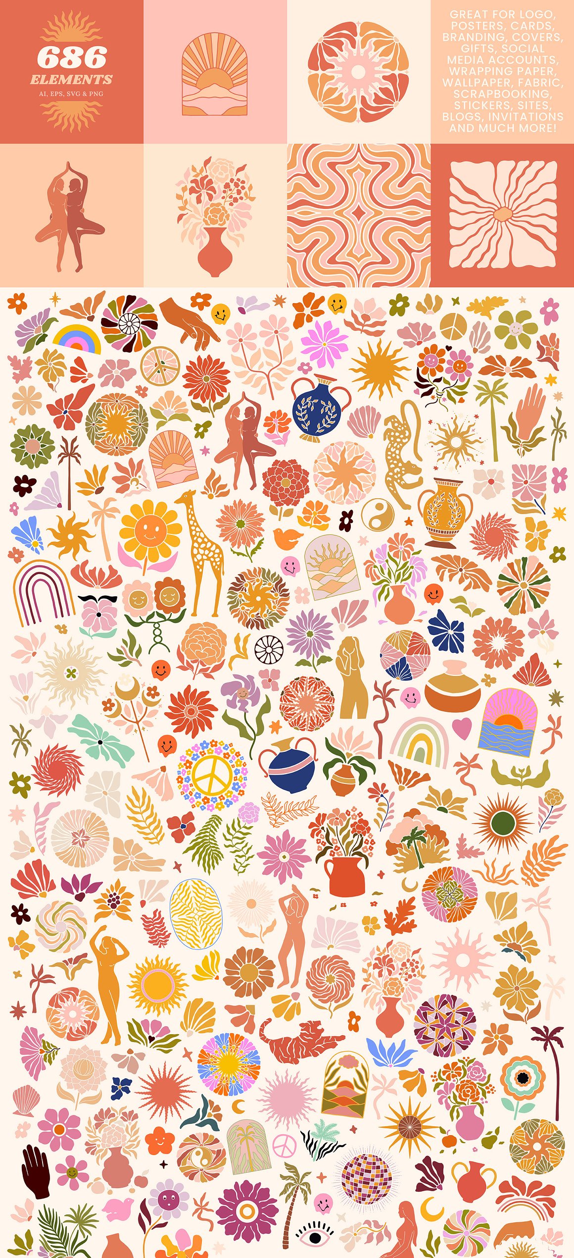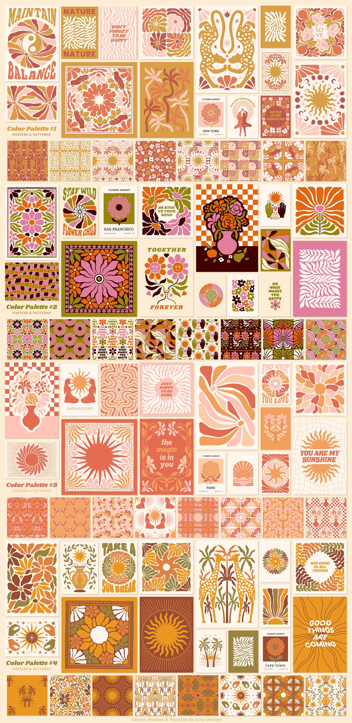 Welcome to the Groovy Posters and Patterns Bundle– a giant collection with over 1160 graphic items inspired by 70s, vintage and nature! Awesome kit to start your own business! This collection was carefully crafted and great attention was paid to details. It consists of different pre-made posters, elements and seamless patterns that can be used individually or combined with other elements. You can easily adjust colors, mix and match them to create something unique.