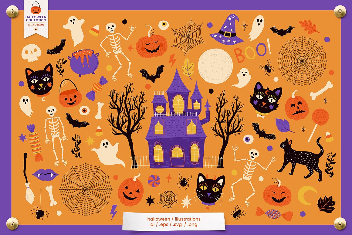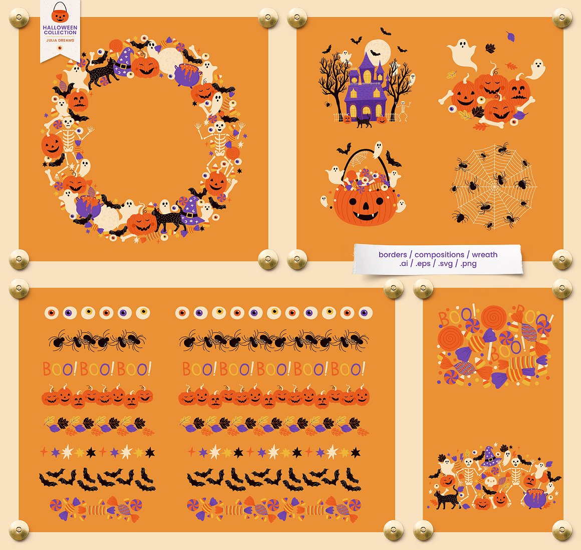 Holidays Around the World by Julia Dreams – this is a set of holiday toolkits including illustrations, seamless patterns, compositions, greeting cards, borders and more. This collection is designed specifically for the Halloween Day. This collection was carefully crafted and great attention was paid to details. It consists of different pre-made elements and seamless patterns that can be used individually or combined with other elements. Use ready-to-use elements and patterns or create your own individual logo using all these elements.