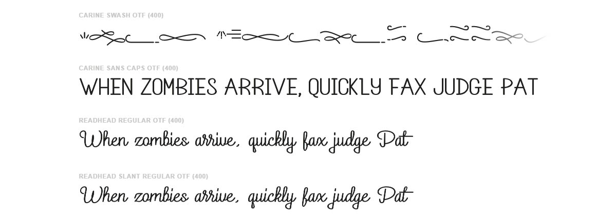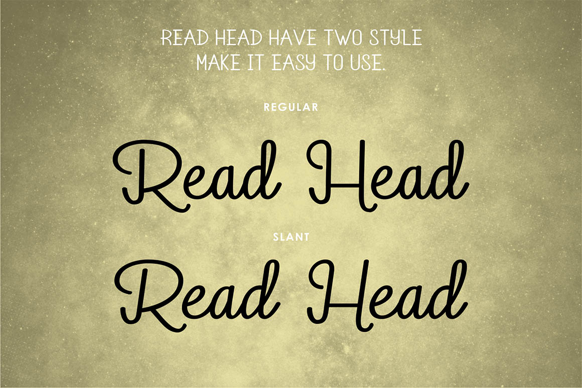 Introducing Read Head; a script with a huge personality. Casual, warm, amiable and elegant, it is perfect if you want to convey individuality and style. Read Head currently has two types, Regular and Slant. In addition we add carine typeface as a complement to be combined.