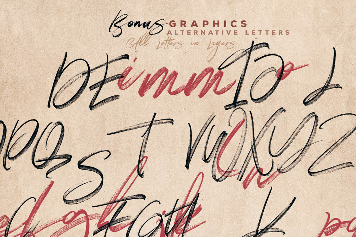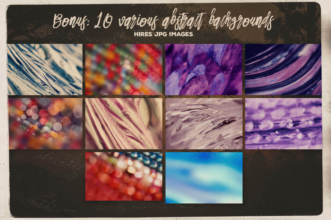 - 18 font families with 50 fonts + 15 SVG realistic brush fonts + 4 extra graphics sets!