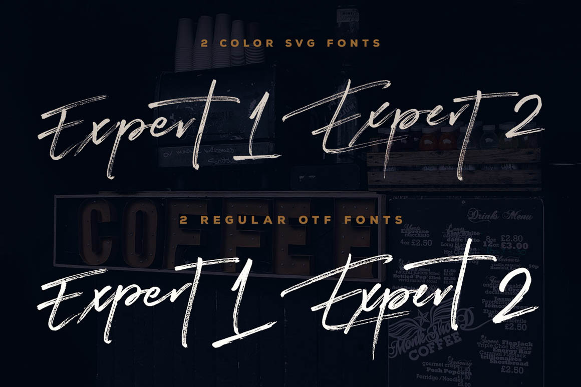 - Expert Brush & SVG Font – 2 regular fonts + 2 SVG fonts