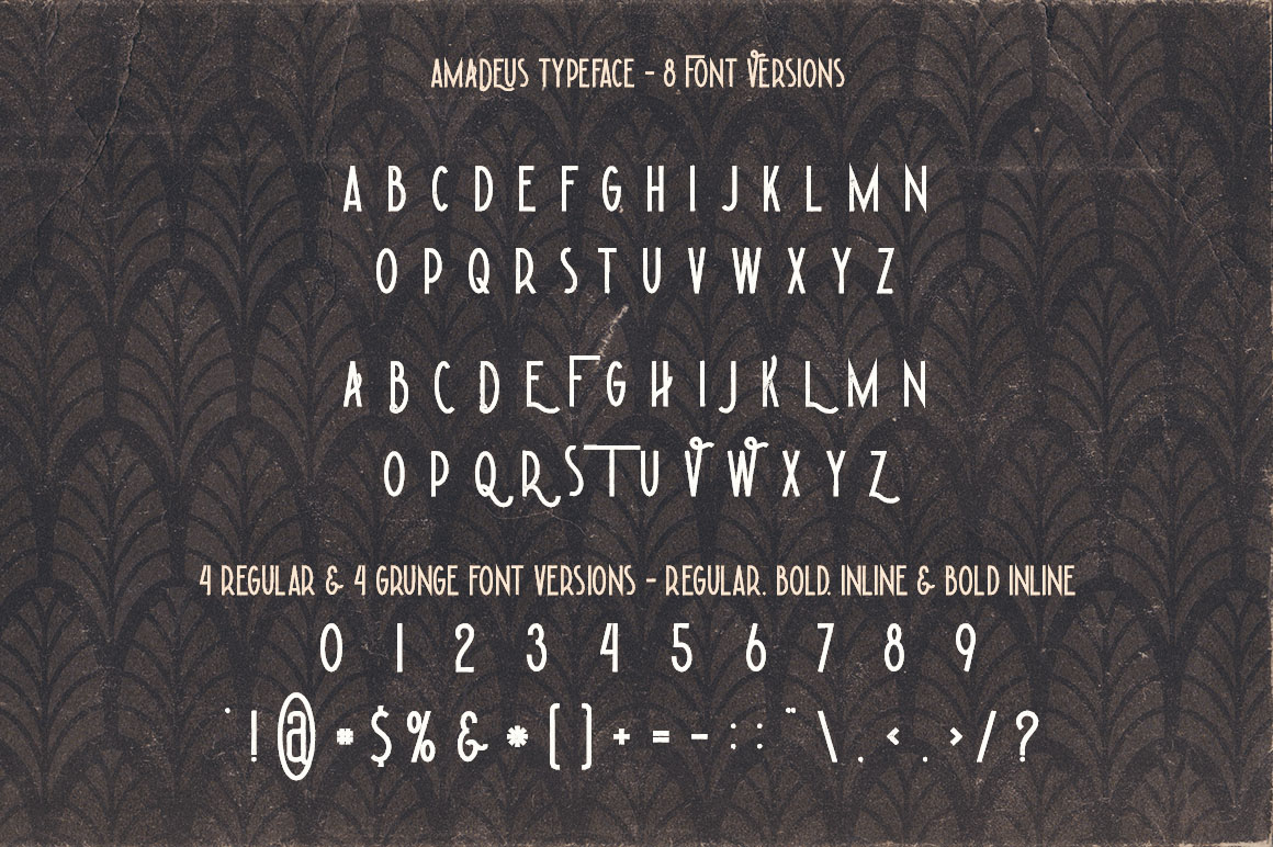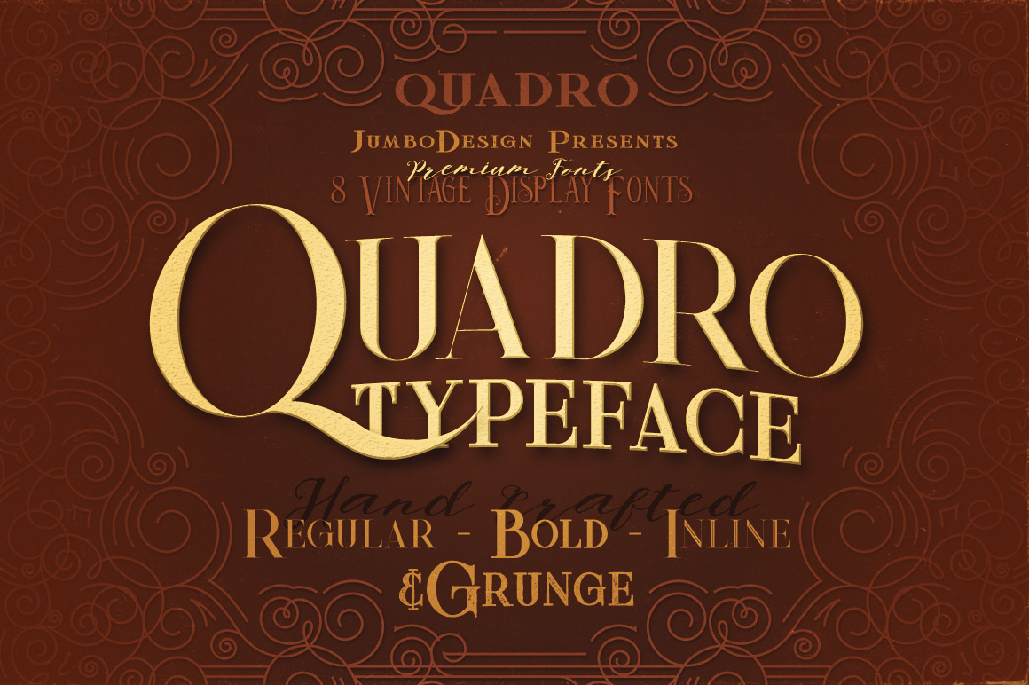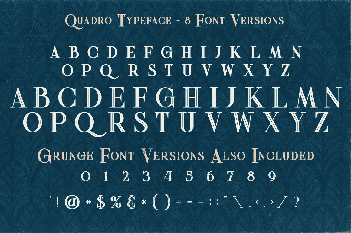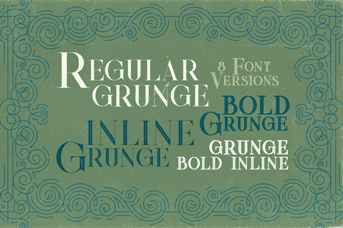 Unique vintage & grunge style custom display font with 8 styles: regular and grunge, inline and grunge, bold & grunge, bold inline & grunge.
