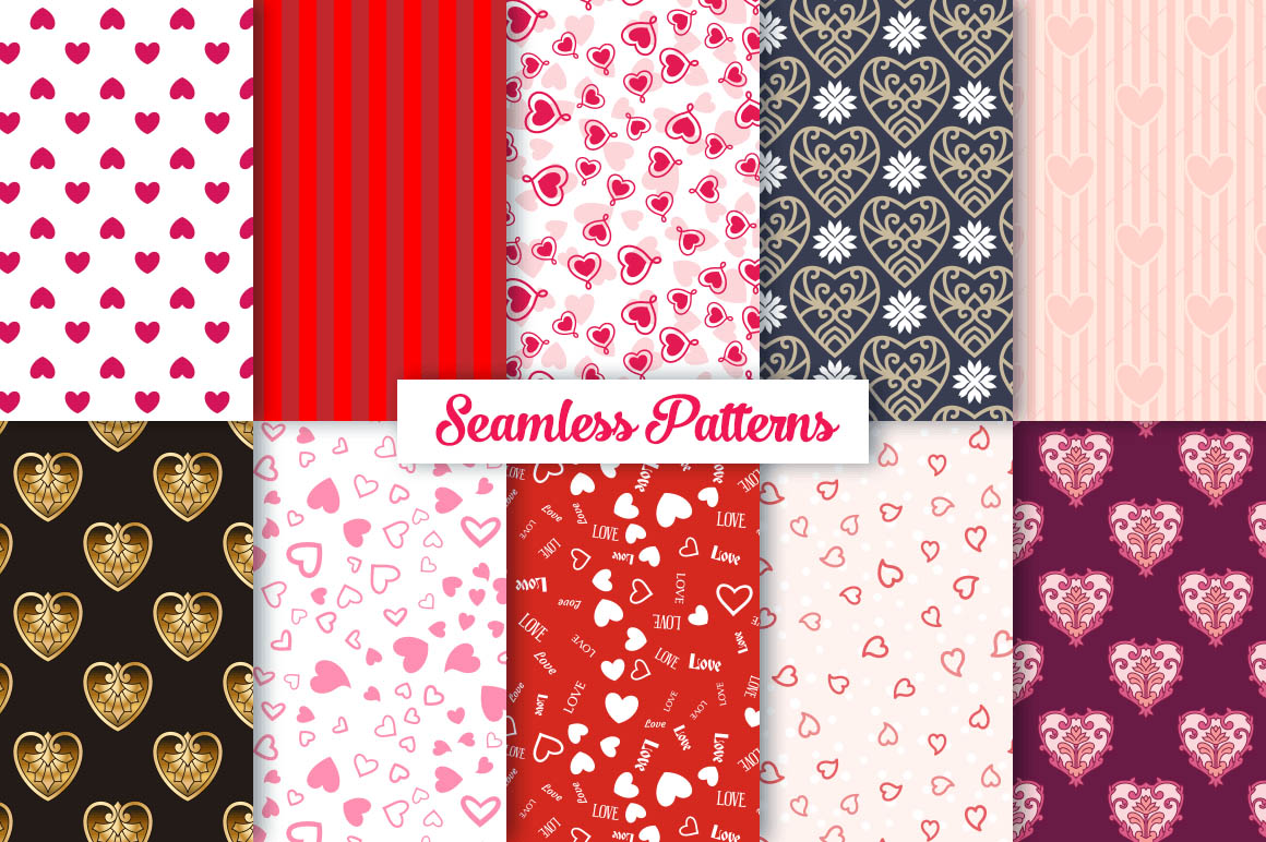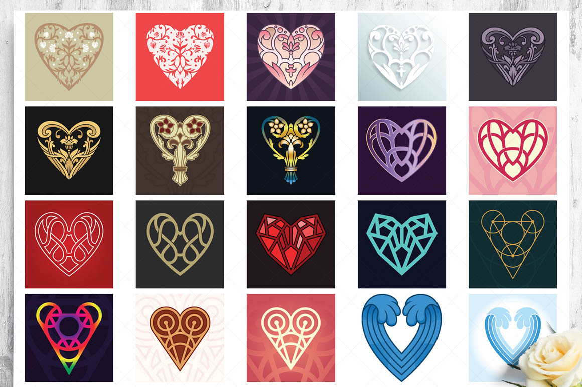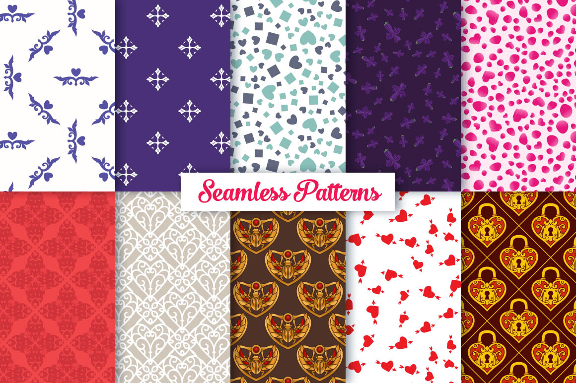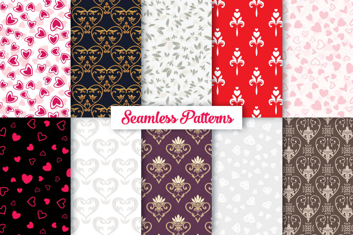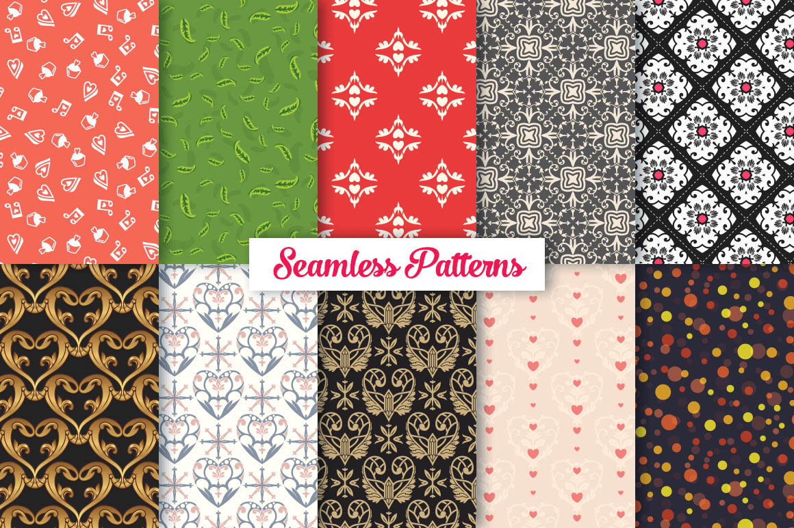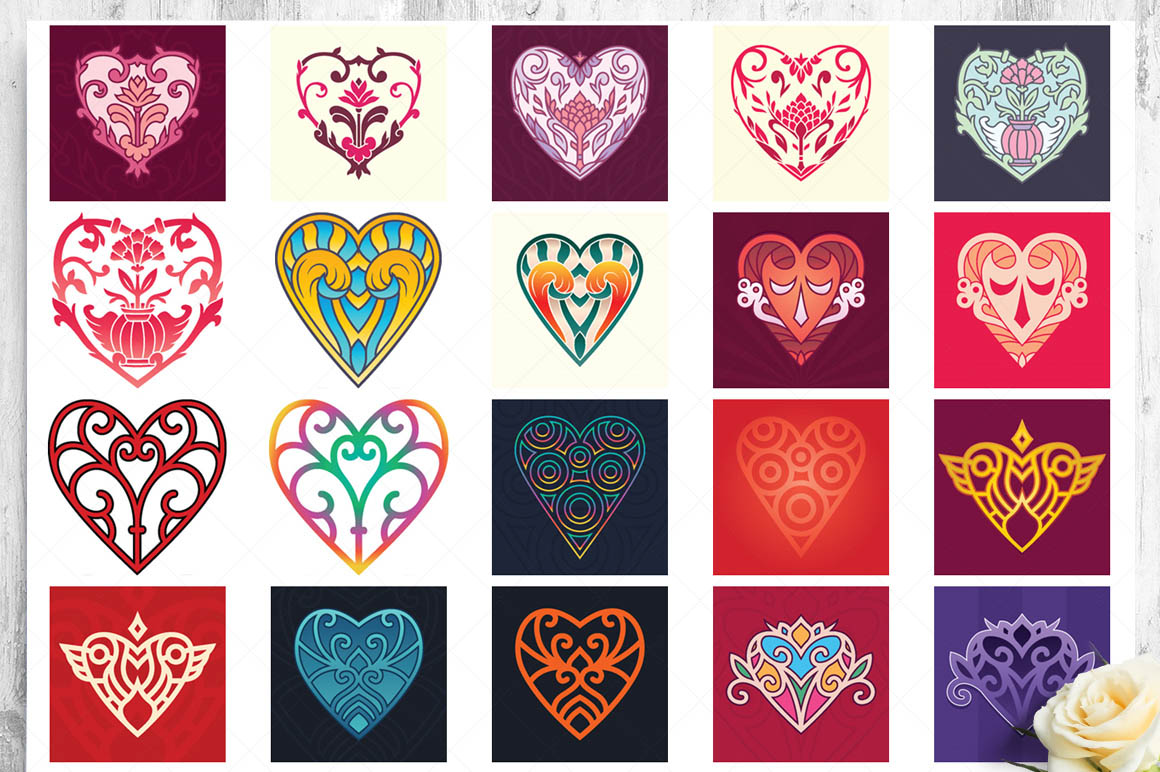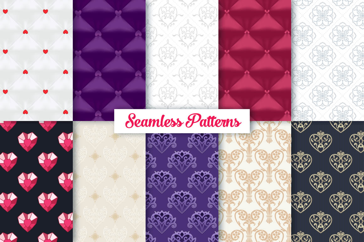 This bundle contain lot of vector heart ornaments, seamless vector & Photoshop patterns. All in various style: vintage, modern, elegant, floral, royal, luxury – great for Love/Wedding/Valentines projects.