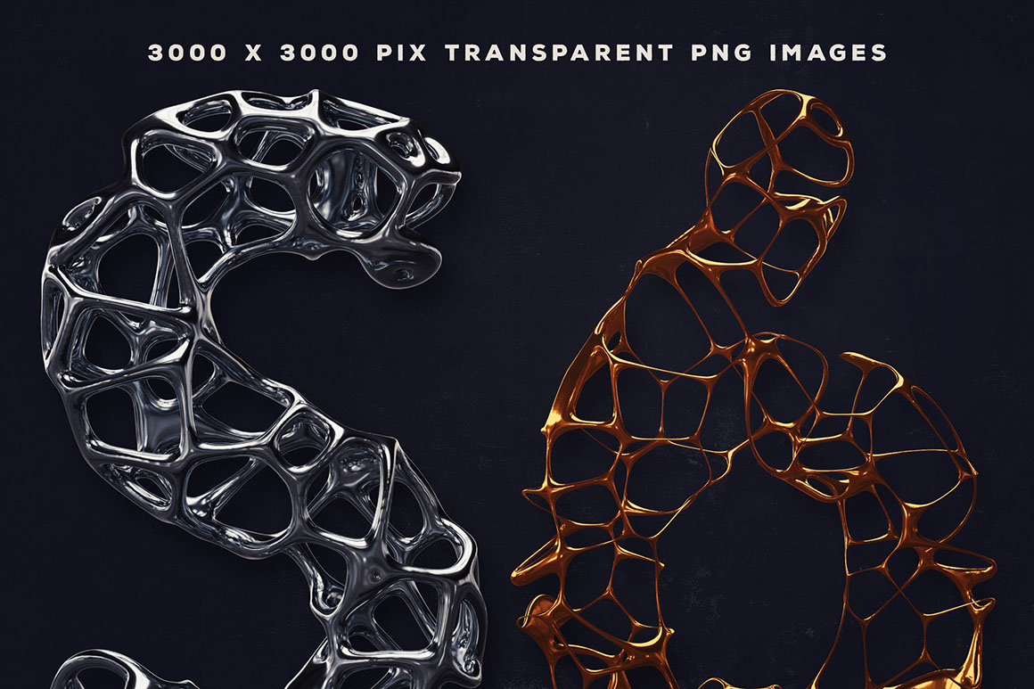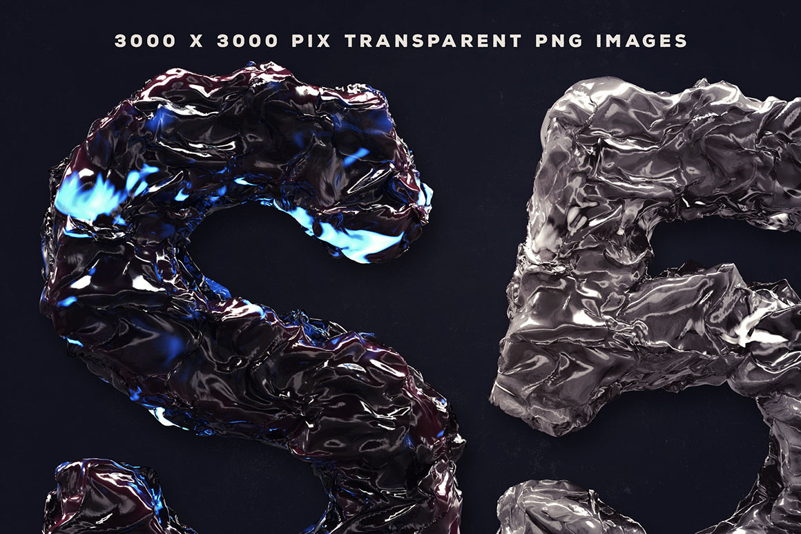 Hi-res & realistic 3D futuristic or liquid metal style lettering renders (3000×3000 – but letter size is little bit smaller). Great for your headers, posters, advertisments – any web or print projects.