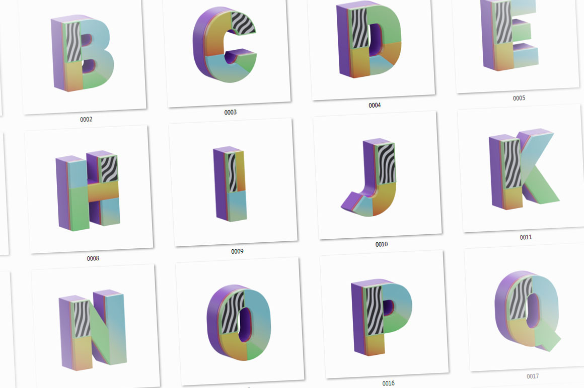Hi-res & realistic 3D creative or artistic lettering renders (3000×3000 – but letter size is little bit smaller). Great for your headers, posters, advertisments – any web or print projects.
