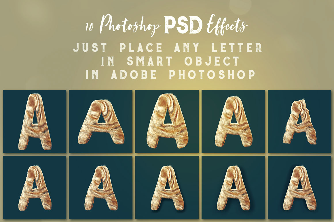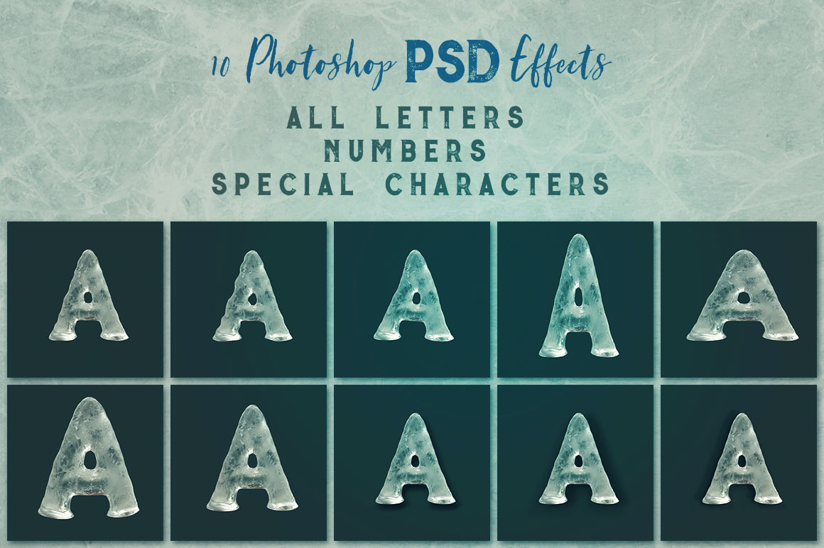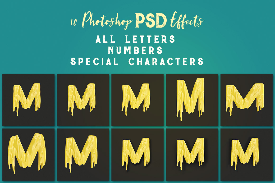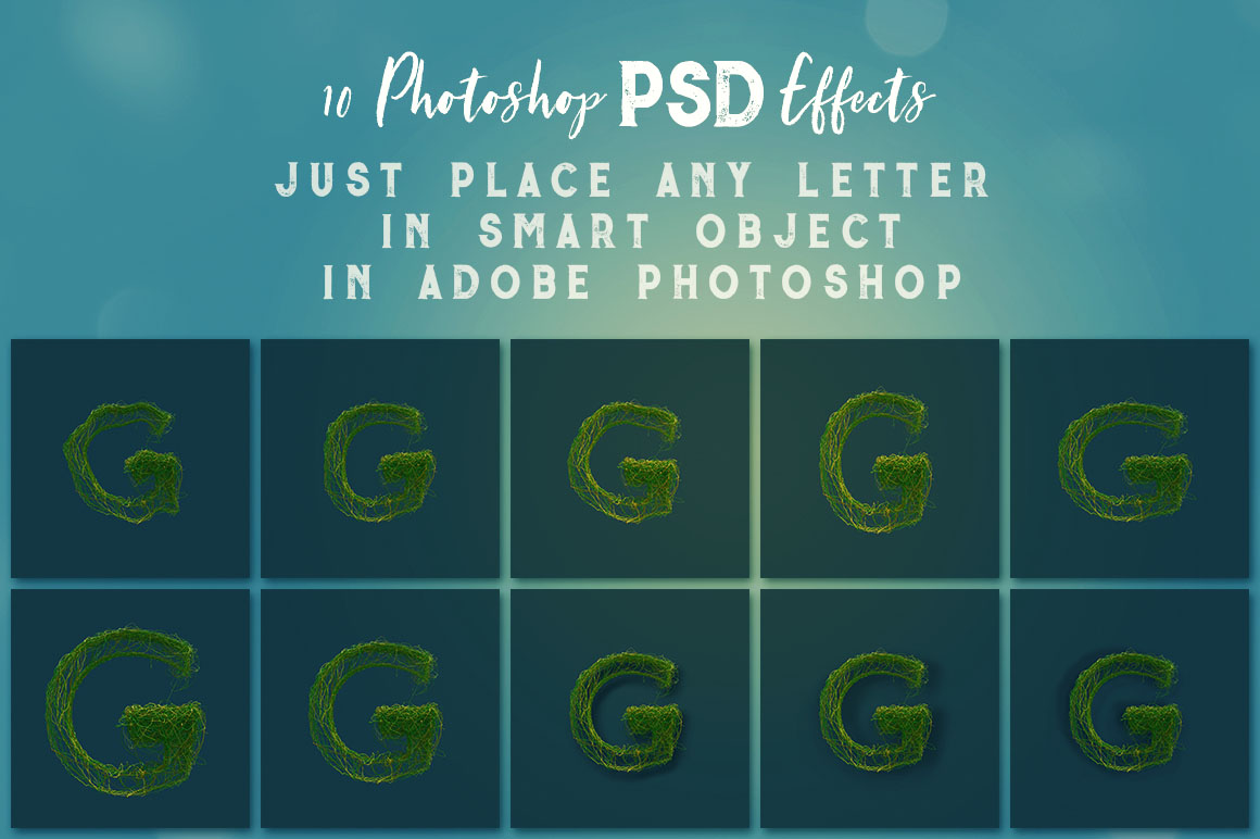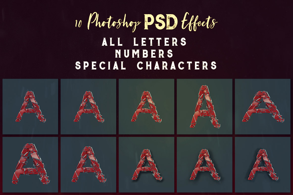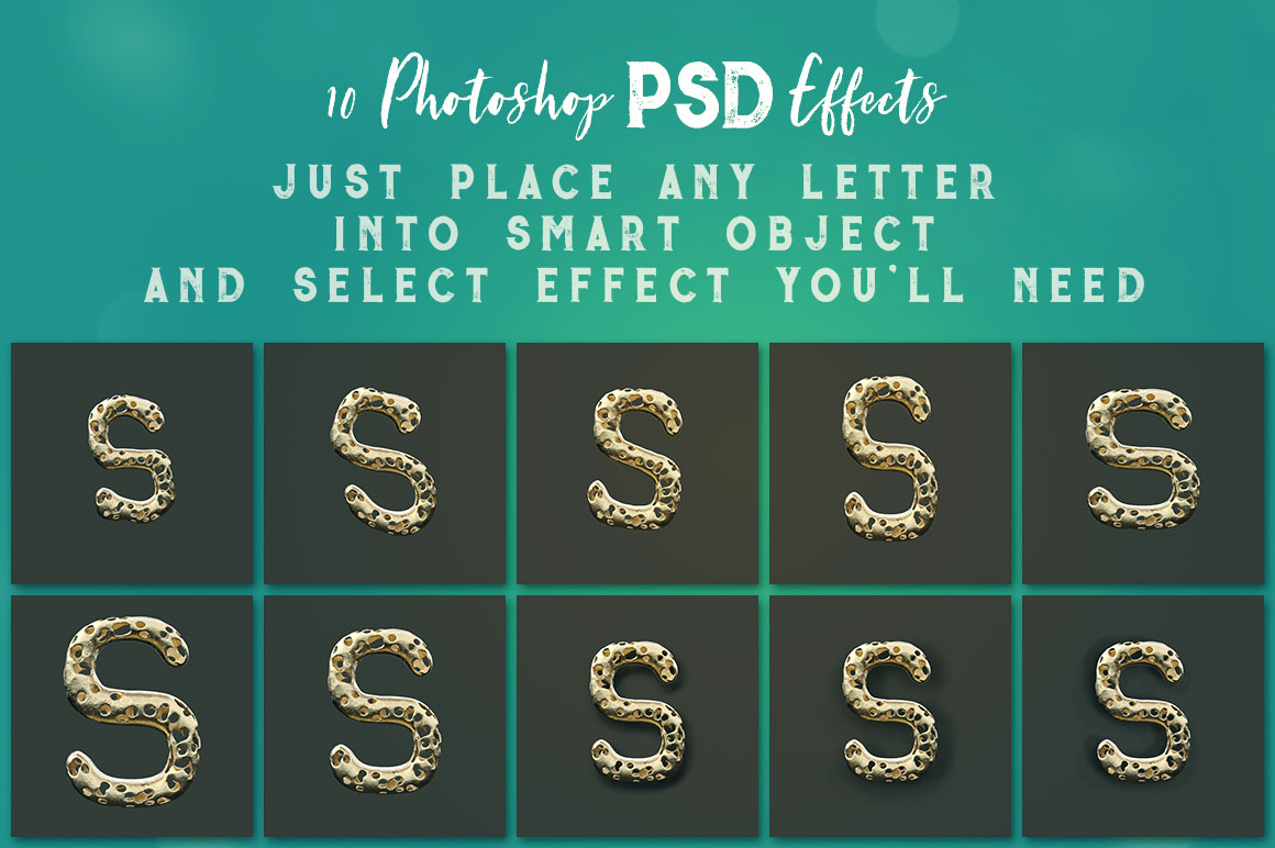 - Layered Photoshop PSD file with 10 effects for these letters – with smart object
