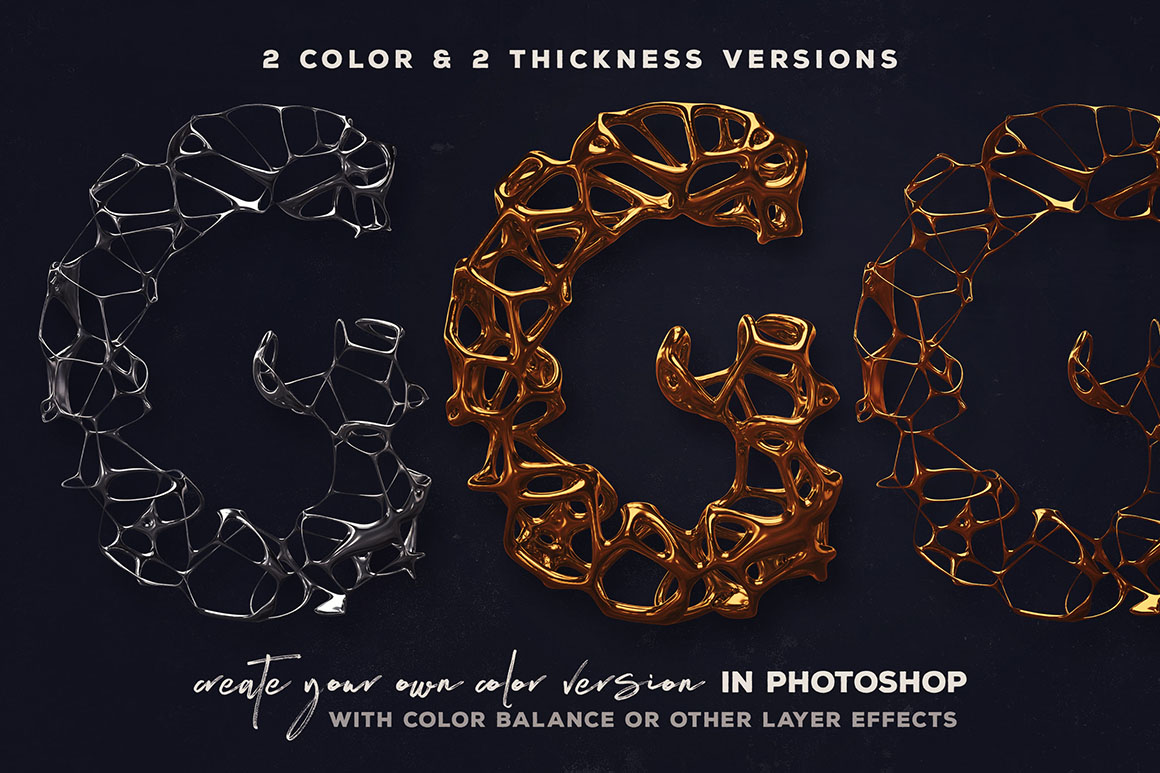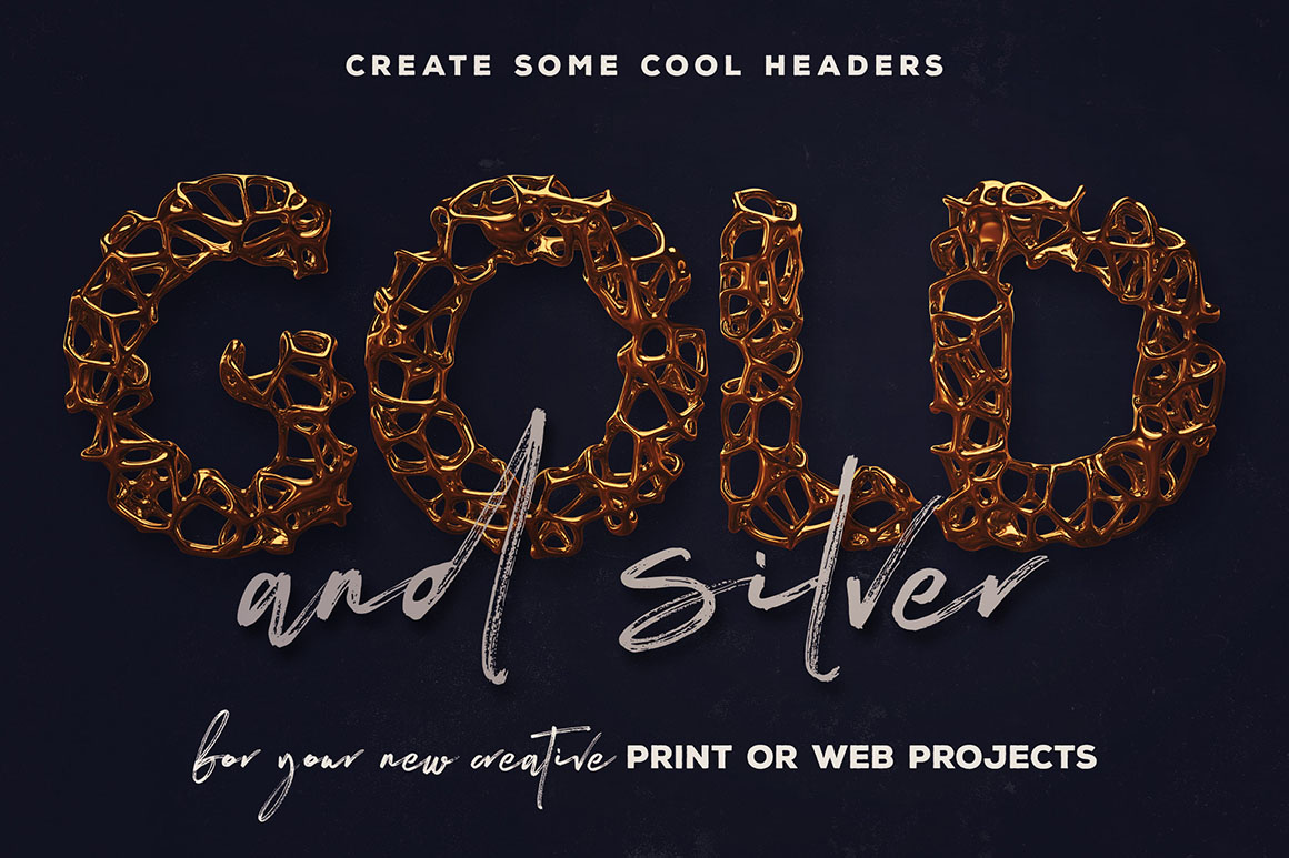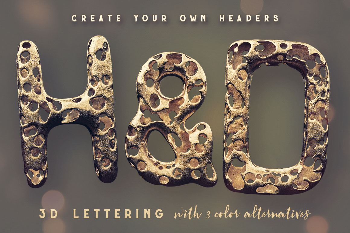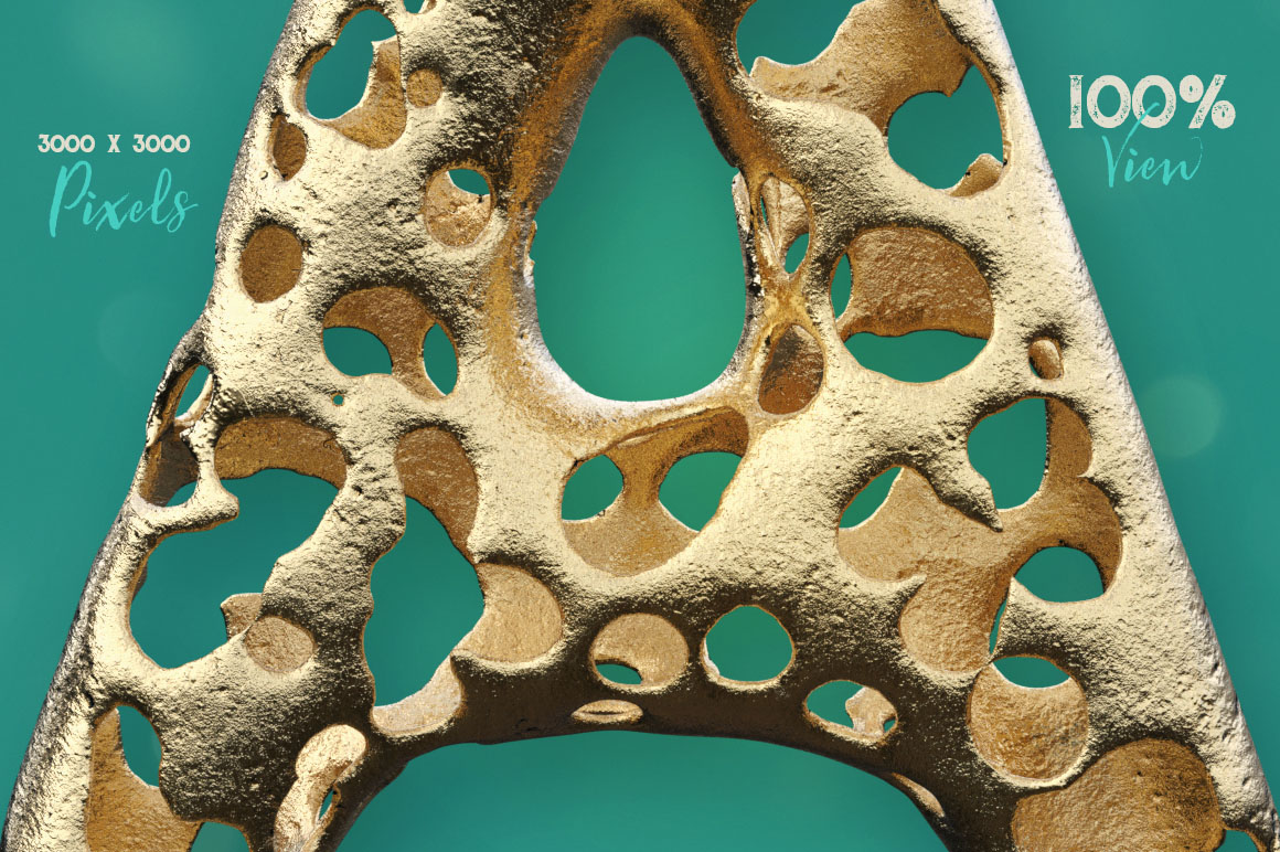 42. Full Of Holes – Golden 3D Lettering from MIIM Design Hi-res 3D golden or metalic lettering renders with holes (3000×3000 – but letter size is around 1500×2000). Great for your headers, posters, advertisments – any web or print projects. You’ll find here also layered PSD file with 10 effets (shadows, effects…) – just replace letter in smart object and you’ll see letter in all 10 effects.