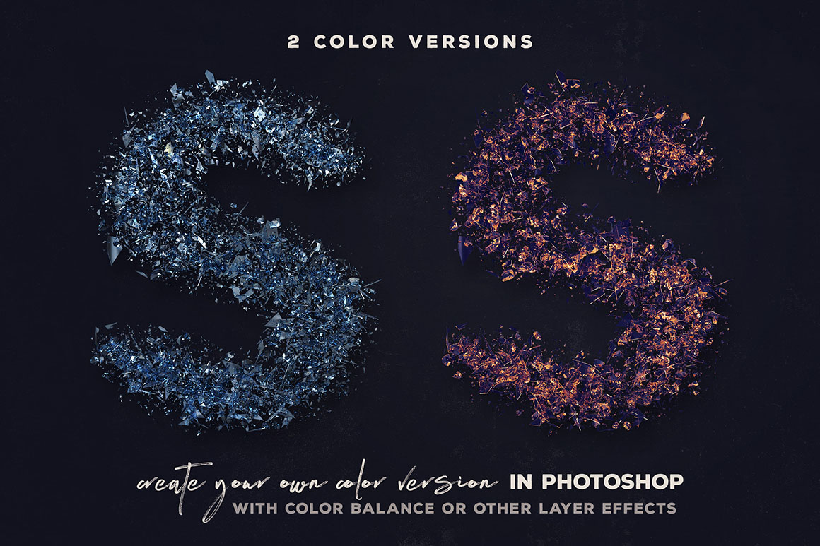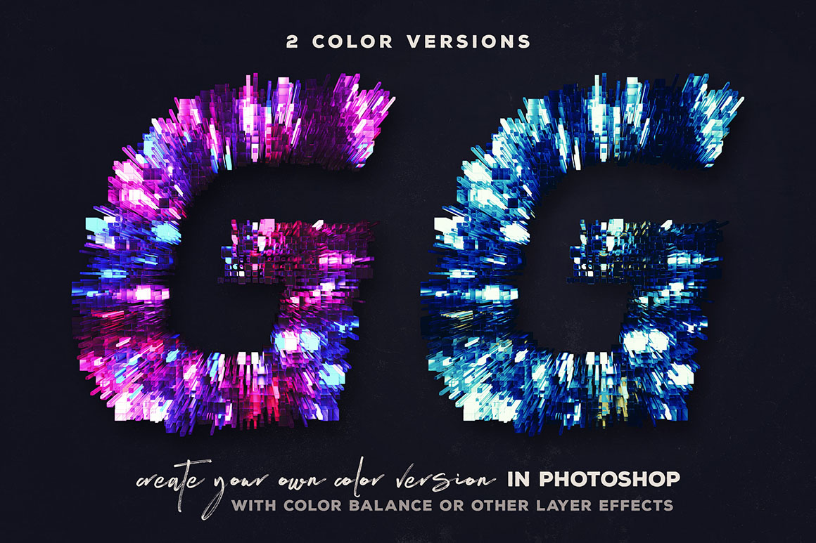 Hi-res 3D futuristic letter in explosion renders (3000×3000 – but letter size is around 1500×2000). Great for your headers, posters, advertisments – any web or print projects. You’ll find here also layered PSD file with 10 effects (shadows, effects…) – just replace letter in smart object and you’ll see letter in all 10 effects.