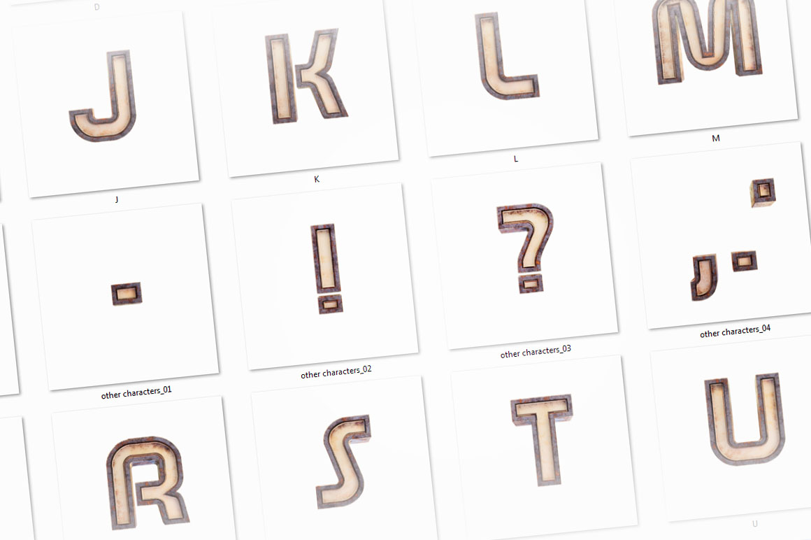 Hi-res & realistic 3D industrial or artistic lettering renders (3000×3000 – but letter size is little bit smaller). Great for your headers, posters, advertisments – any web or print projects.
