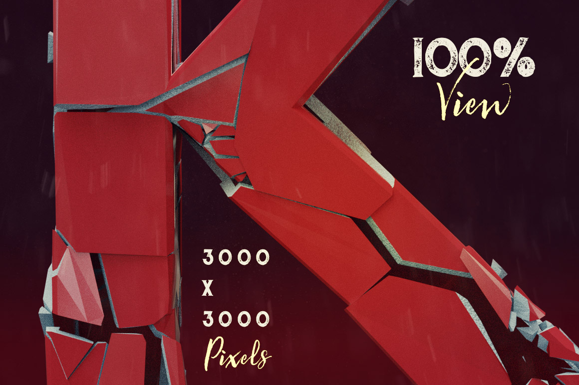 Hi-res 3D scratched ice letter renders (3000×3000 – but letter size is around 1500×2000). Great for your headers, posters, advertisments – any web or print projects. You’ll find here also layered PSD file with 10 effets (shadows, effects…) – just replace letter in smart object and you’ll see letter in all 10 effects.