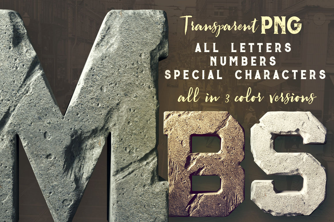 Hi-res 3D grunge stone letter renders (3000×3000 – but letter size is around 1500×2000). Great for your headers, posters, advertisments – any web or print projects. You’ll find here also layered PSD file with 10 effets (shadows, effects…) – just replace letter in smart object and you’ll see letter in all 10 effects.