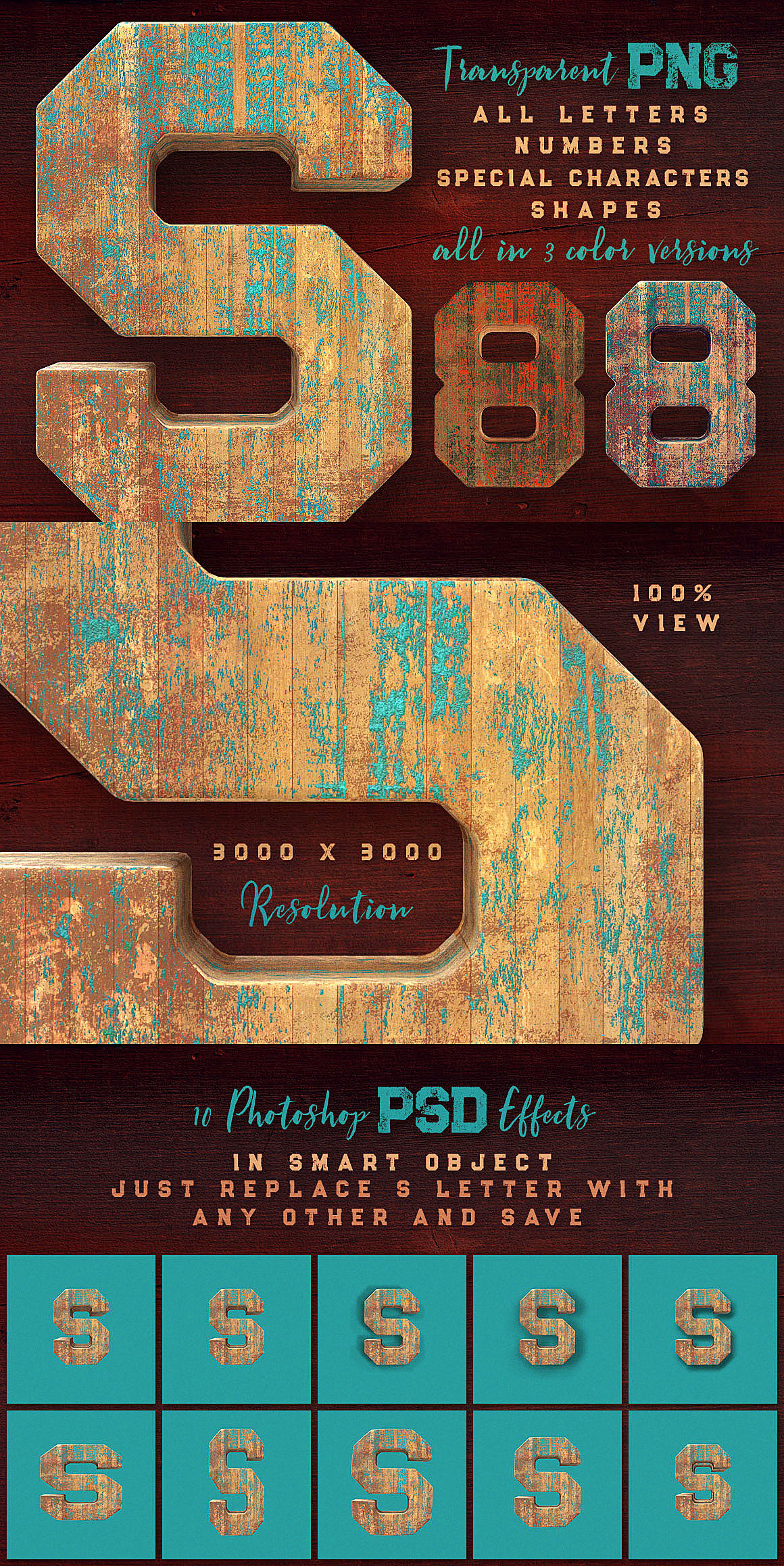 Hi-res 3D grunge painted wood letter renders (3000×3000 – but letter size is around 1500×2000). Great for your headers, posters, advertisments – any web or print projects. You’ll find here also 20 transparent PNG shapes and layered PSD file with 10 effets (shadows, effects…) – just replace letter in smart object and you’ll see letter in all 10 effects.