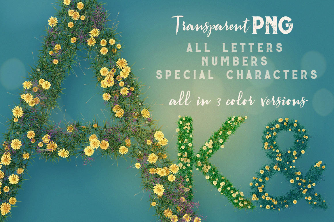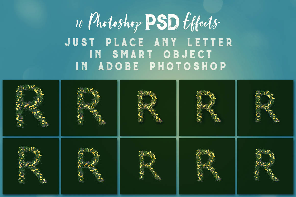 44. Summer Flower – 3D Lettering from MIIM Design Hi-res 3D grass or summer flower lettering renders (3000×3000 – but letter size is around 2000×2000). Great for your headers, posters, advertisments – any web or print projects. You’ll find here also layered PSD file with 10 effets (shadows, effects…) – just replace letter in smart object and you’ll see letter in all 10 effects.