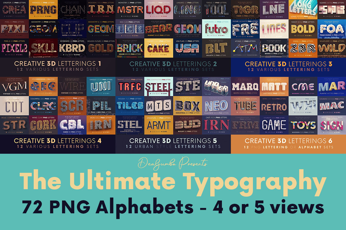 Creative and super BIG 3D typography bundle 3 with 72 various lettering sets – 6 lettering or 3D image alphabet sets in 1 BIG bundle! All are great for any print or web projects, so maybe it’s time to add something creative and unique to your typography toolbox 😉