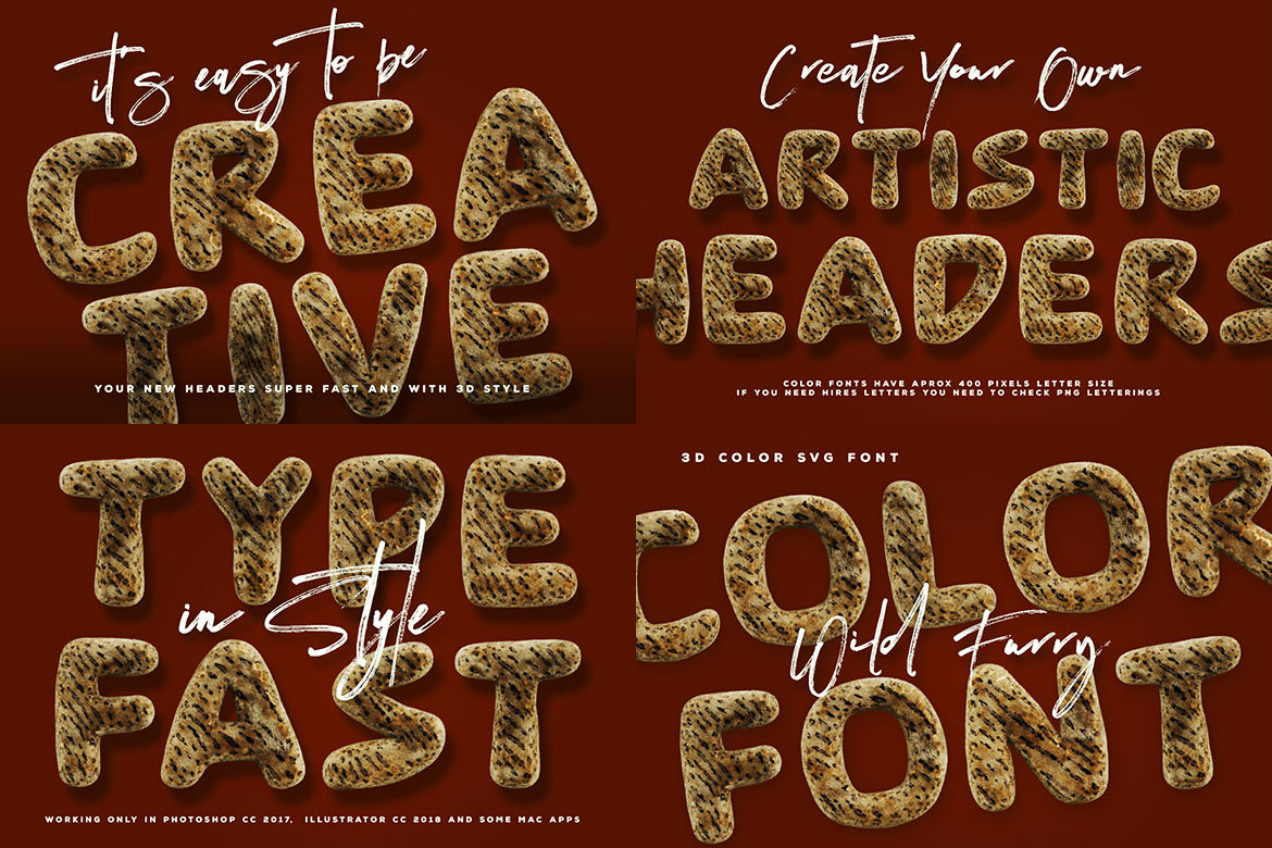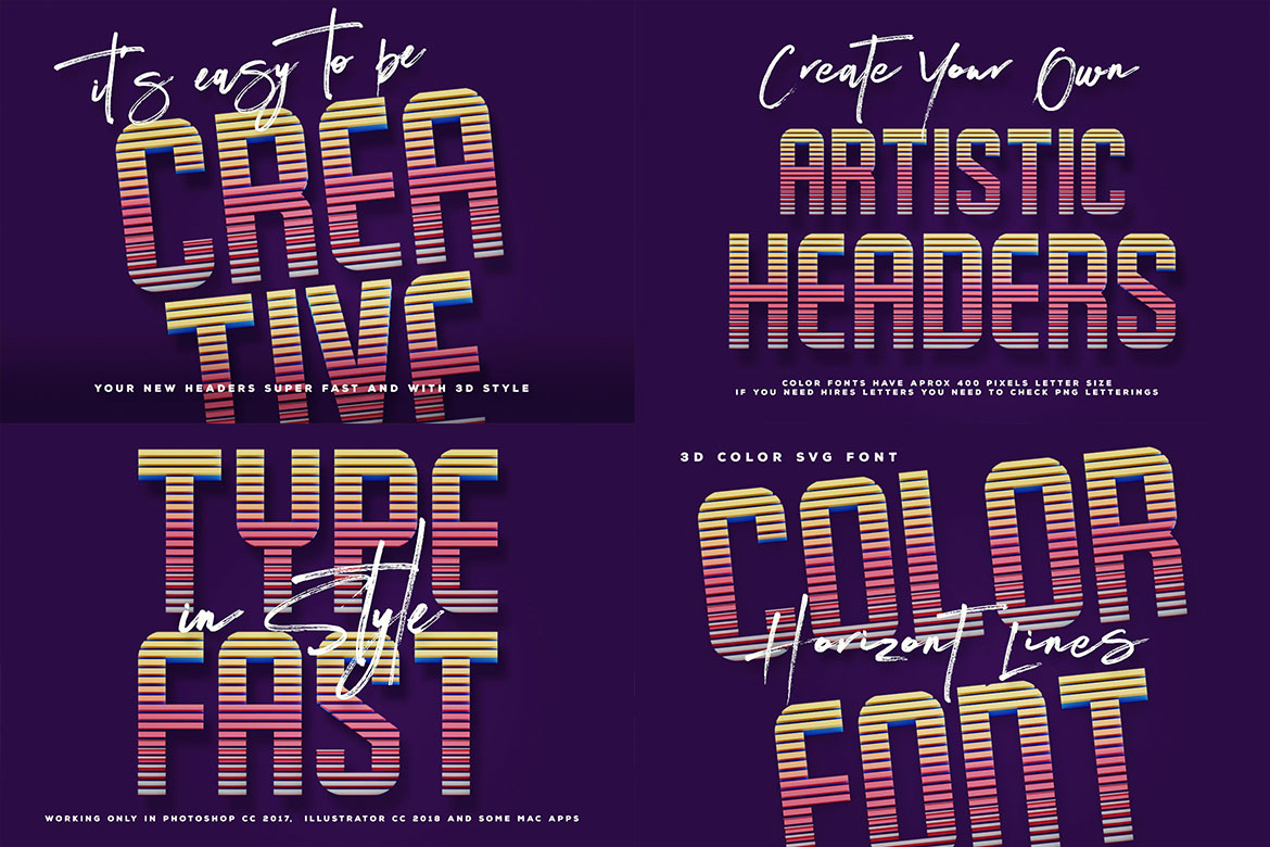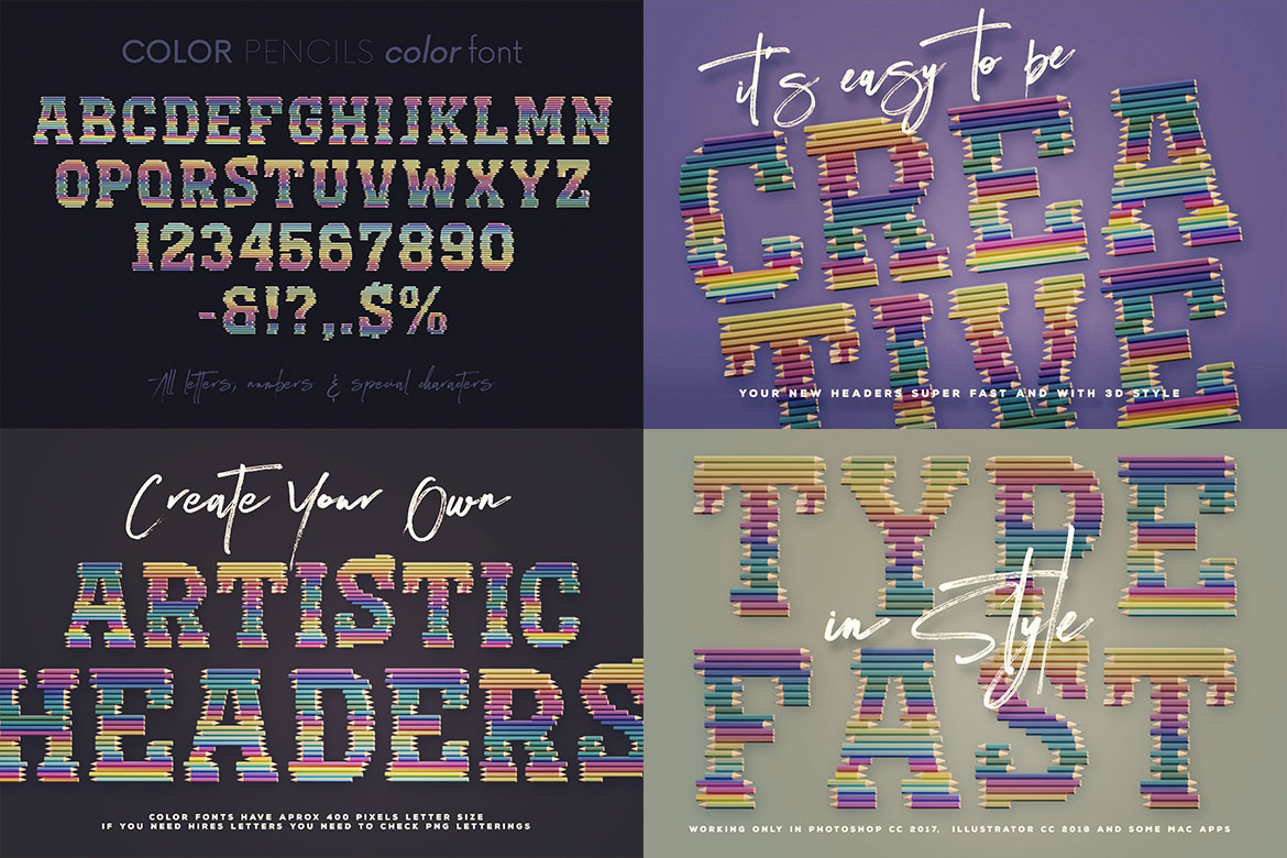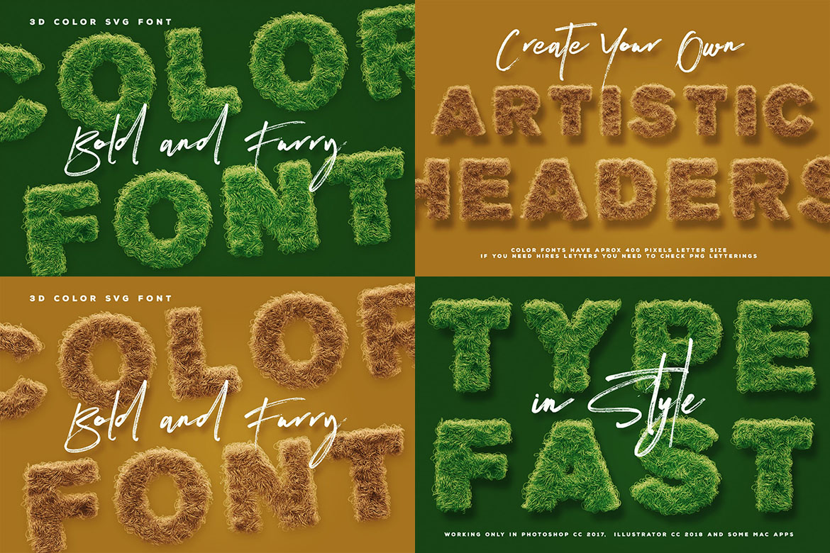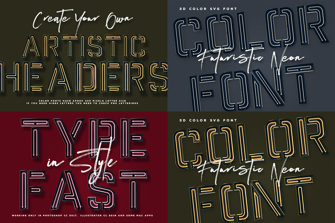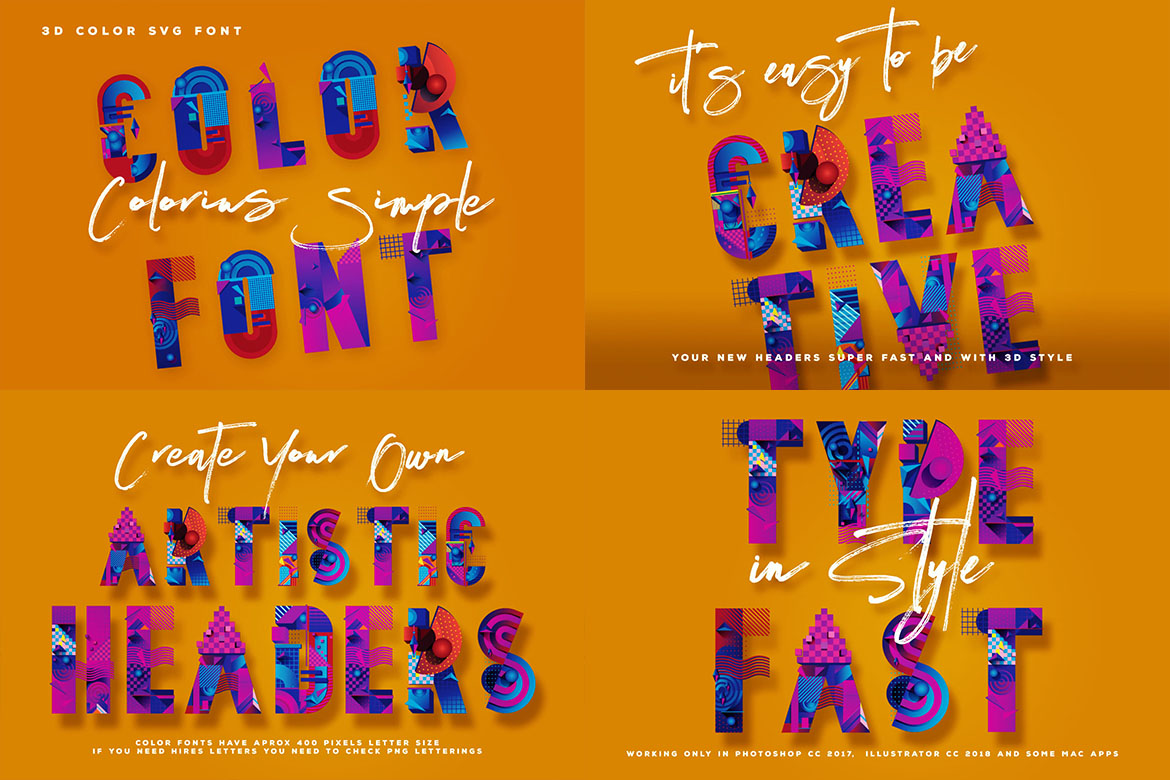 - color SVG fonts – working only in Photoshop CC 2017+, Illustrator CC 2018+ and some Mac apps!