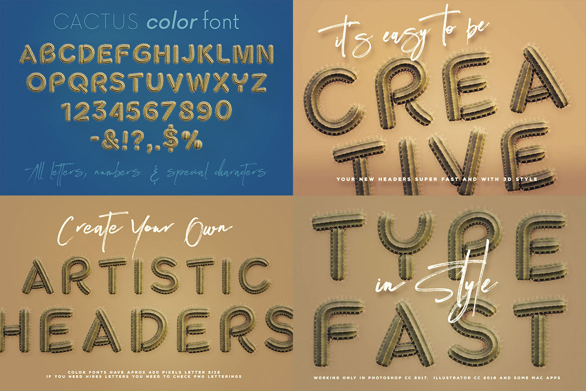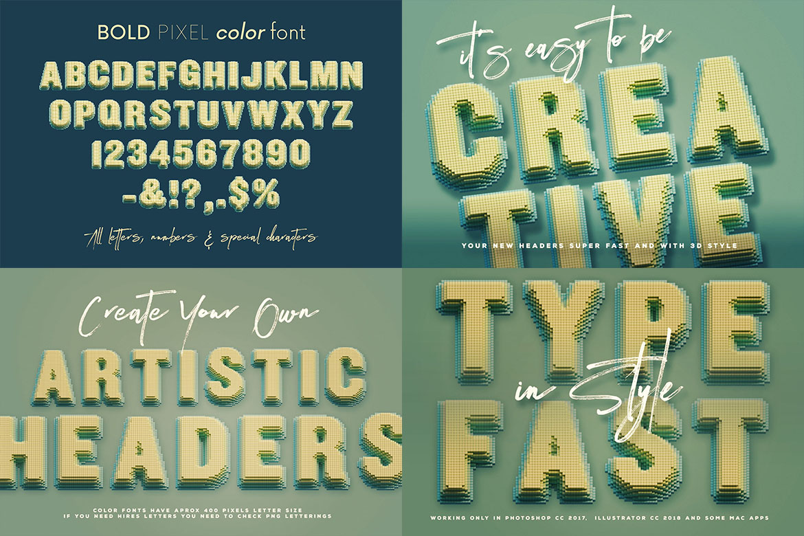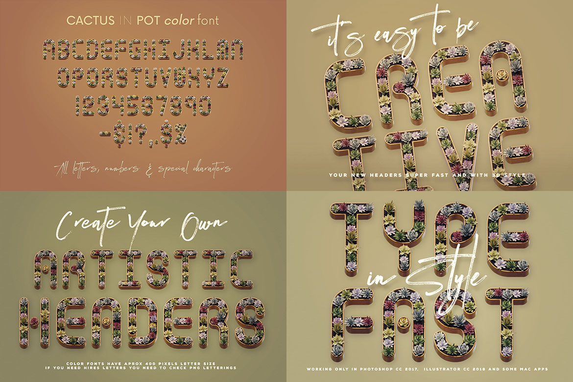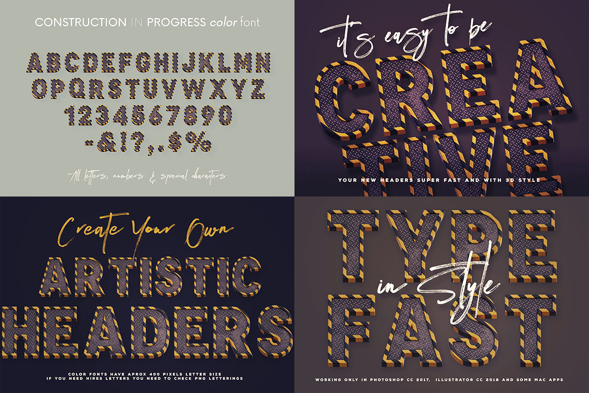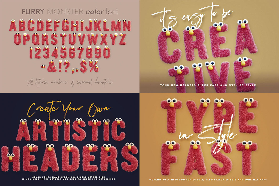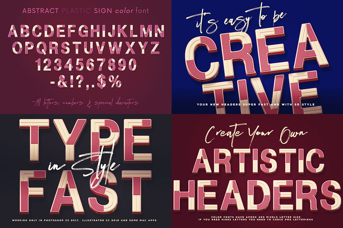 - color SVG fonts – working only in Photoshop CC 2017+, Illustrator CC 2018+ and some Mac apps!