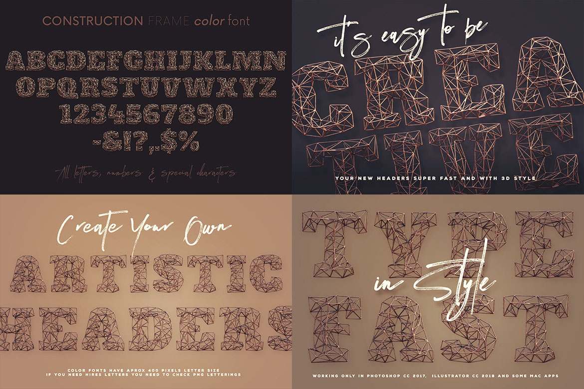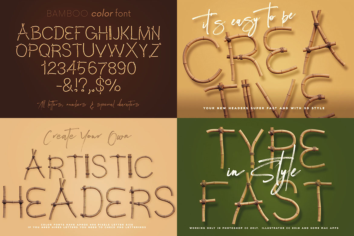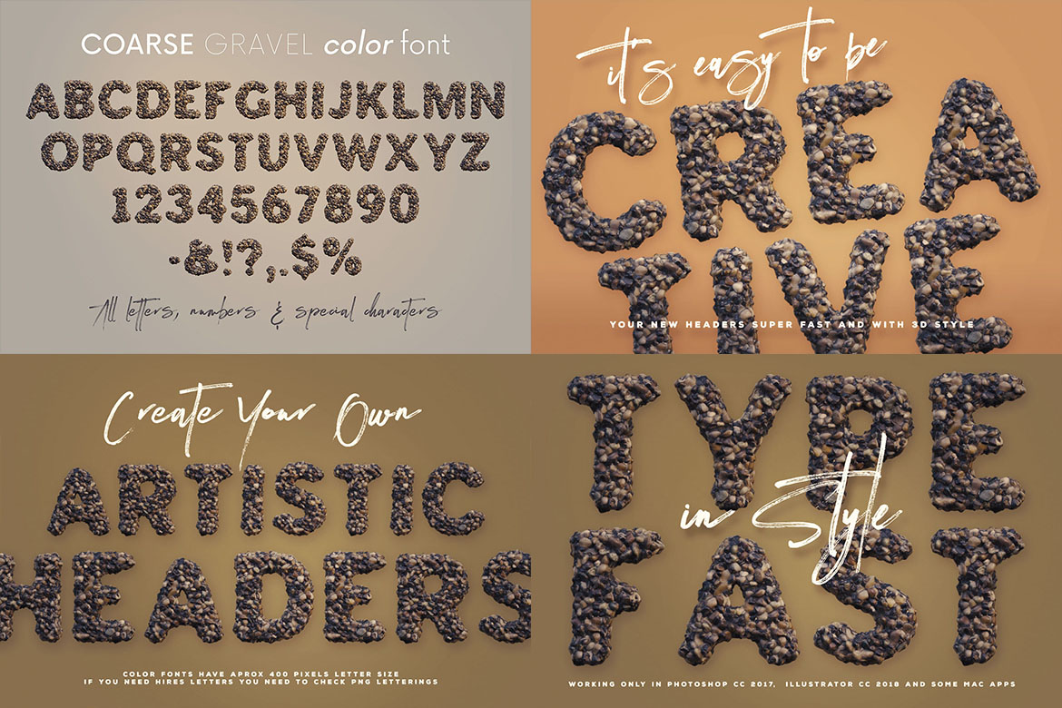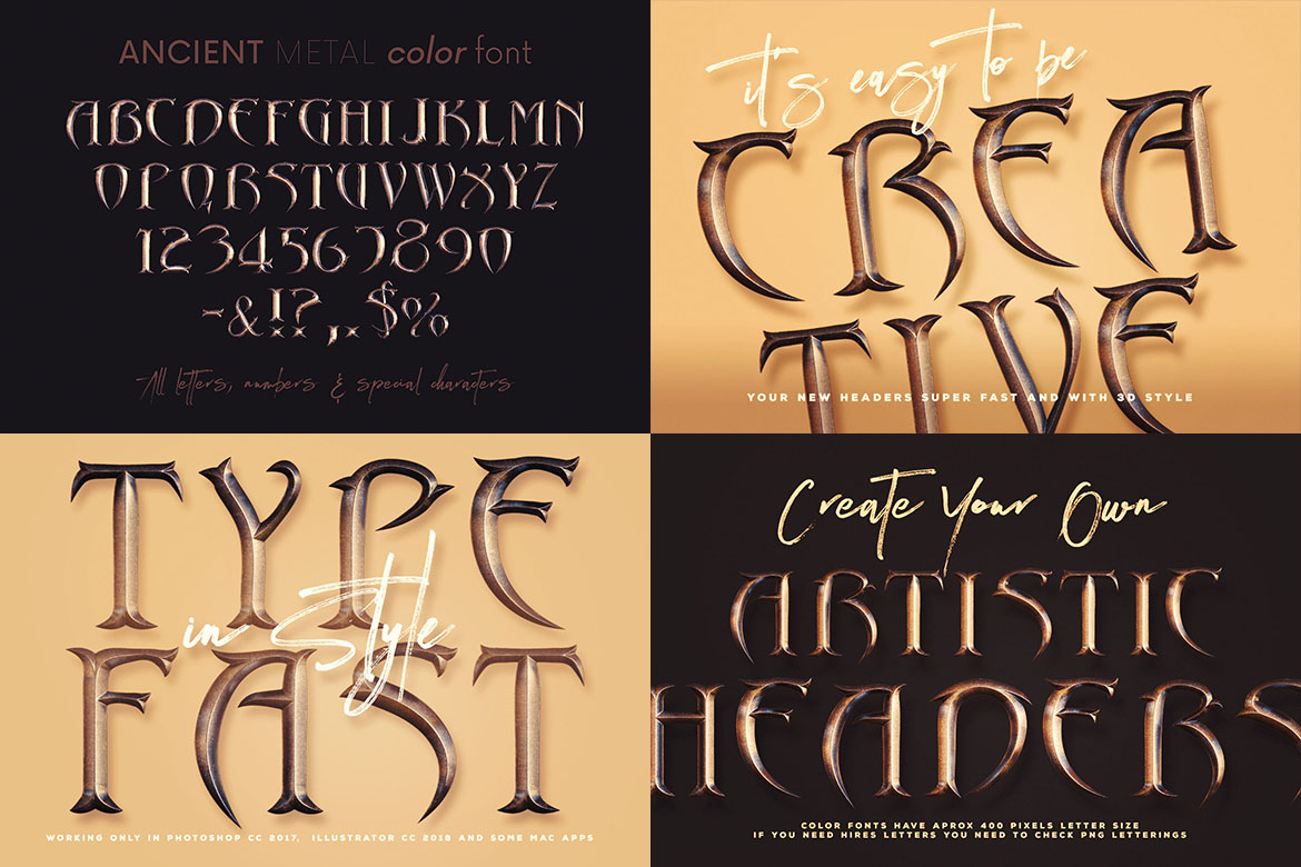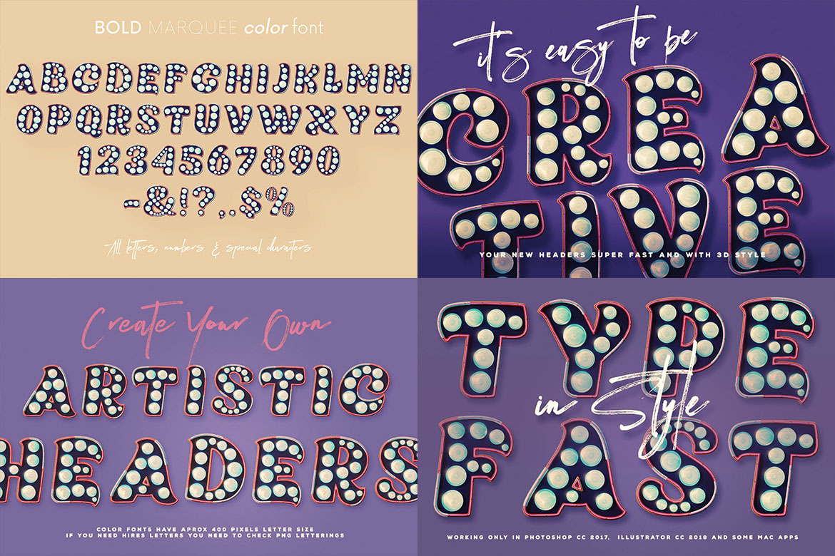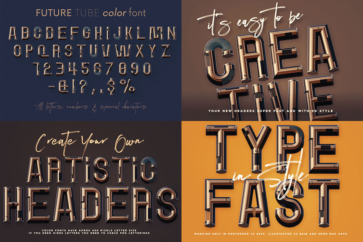 - color SVG fonts – working only in Photoshop CC 2017+, Illustrator CC 2018+ and some Mac apps!