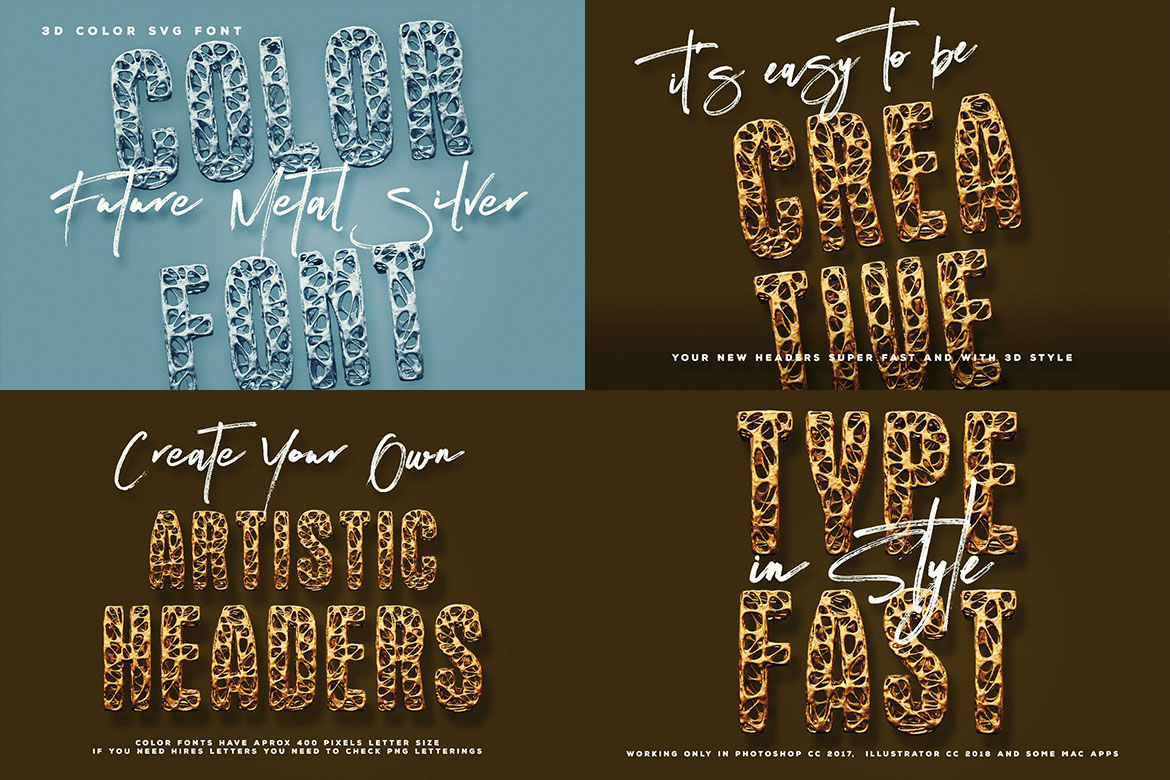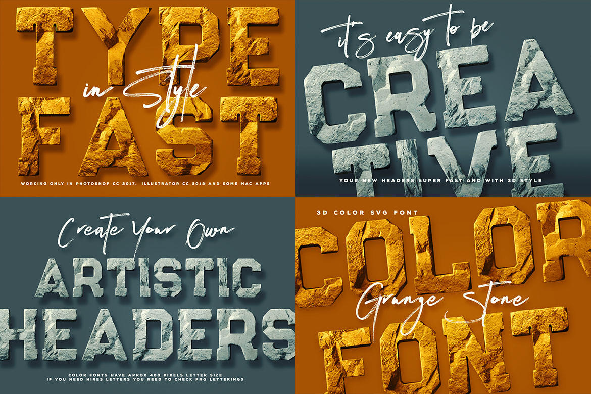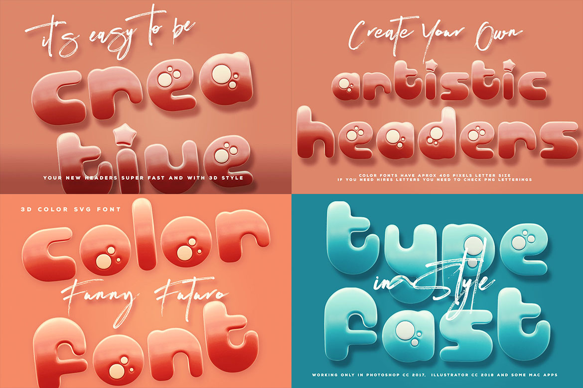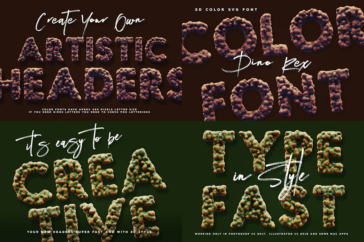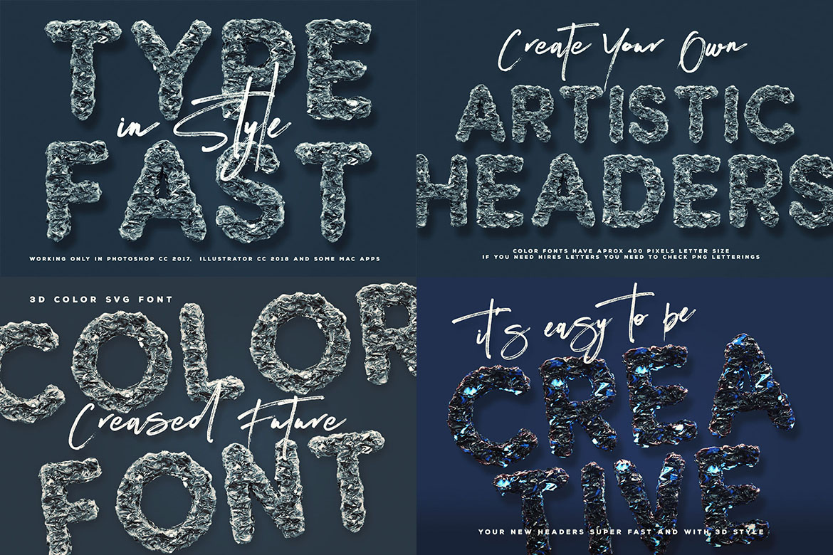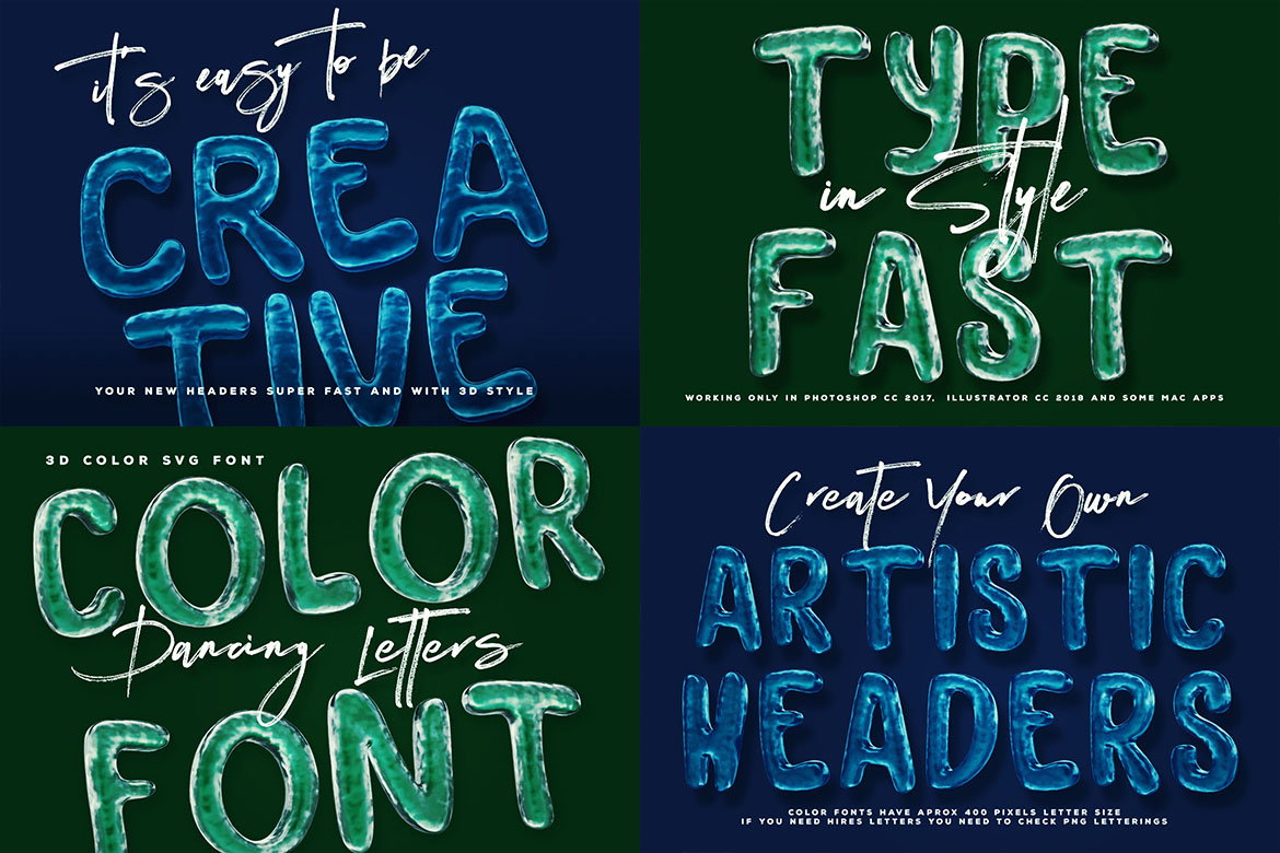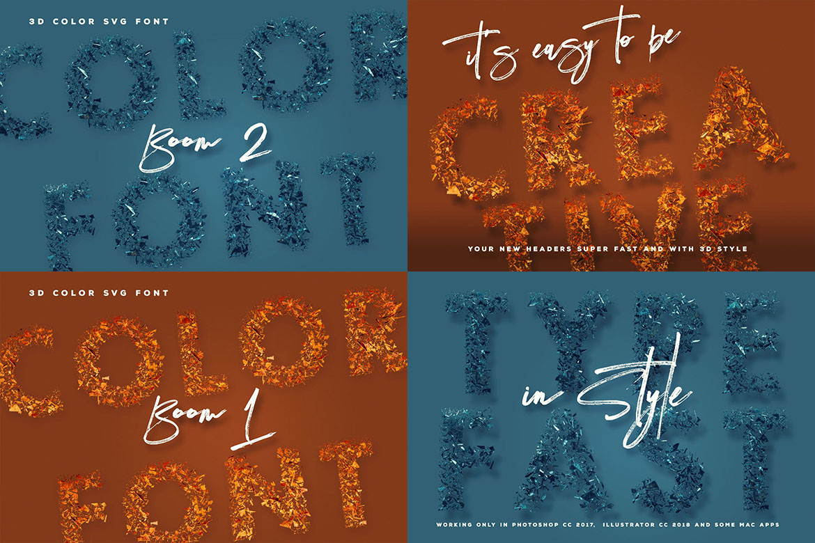 - 100 super realistic & 3D style color SVG font sets for your new typography projects!