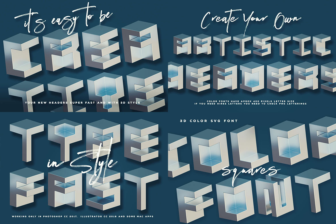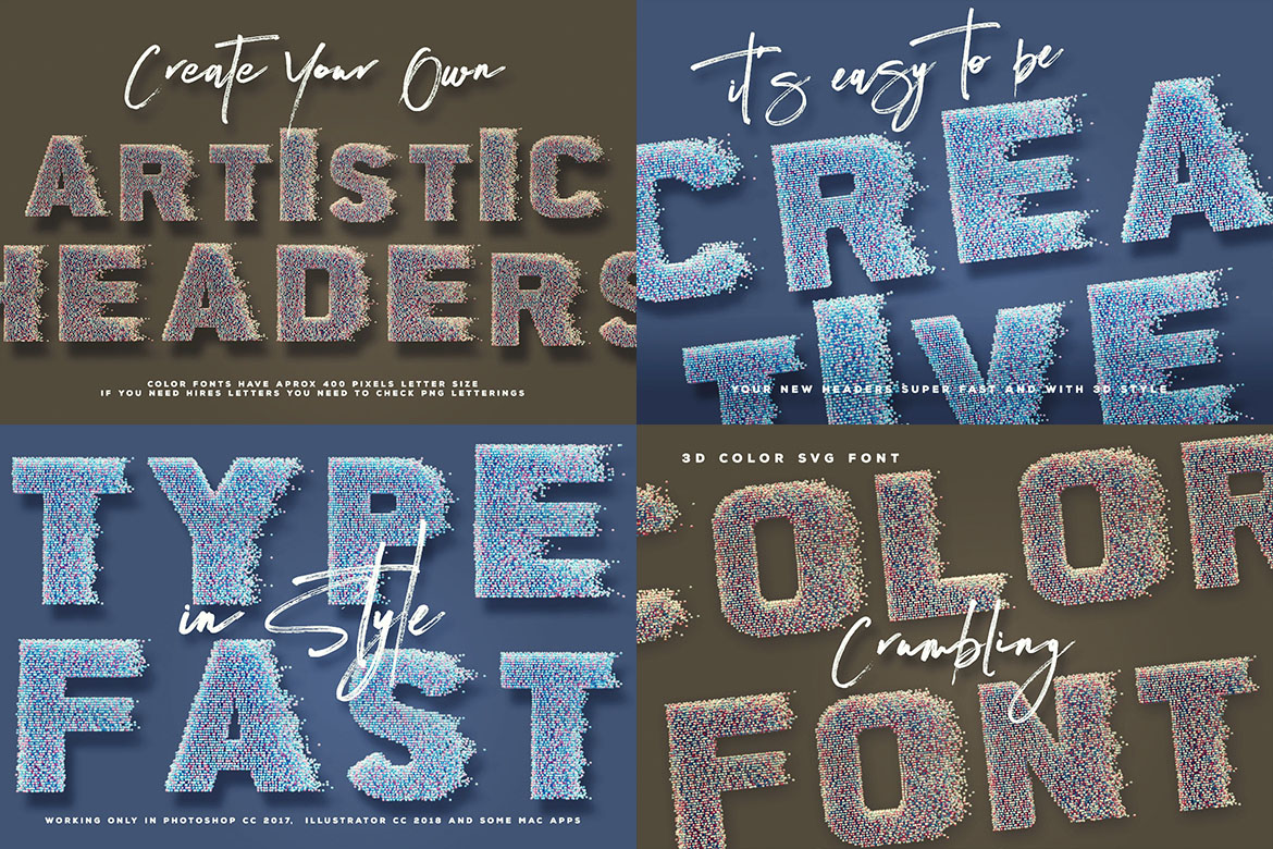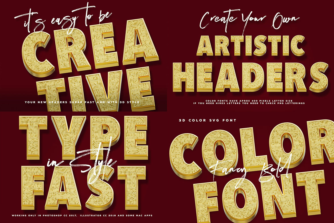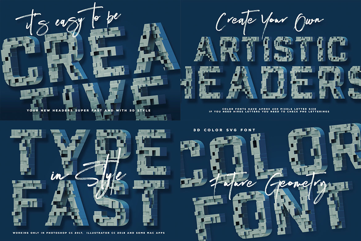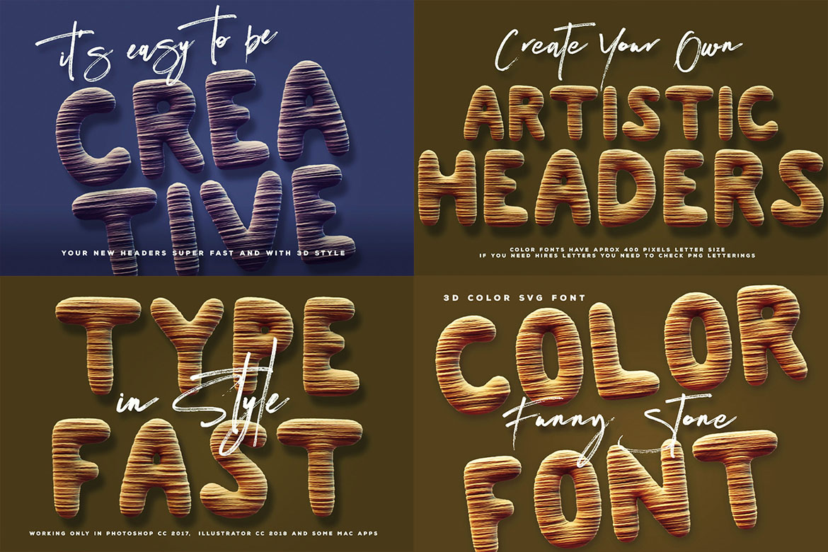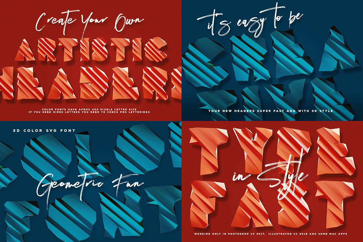 - 100 super realistic & 3D style color SVG font sets for your new typography projects!