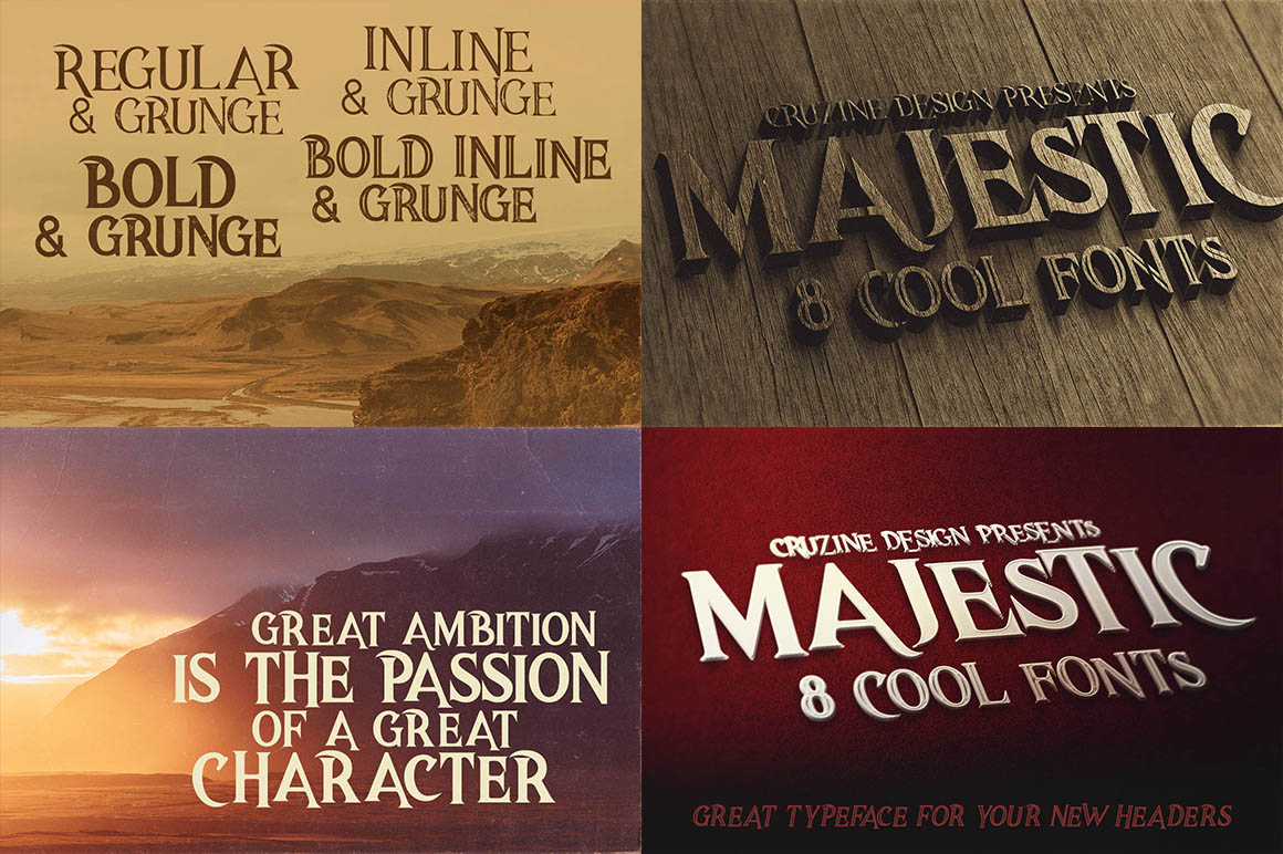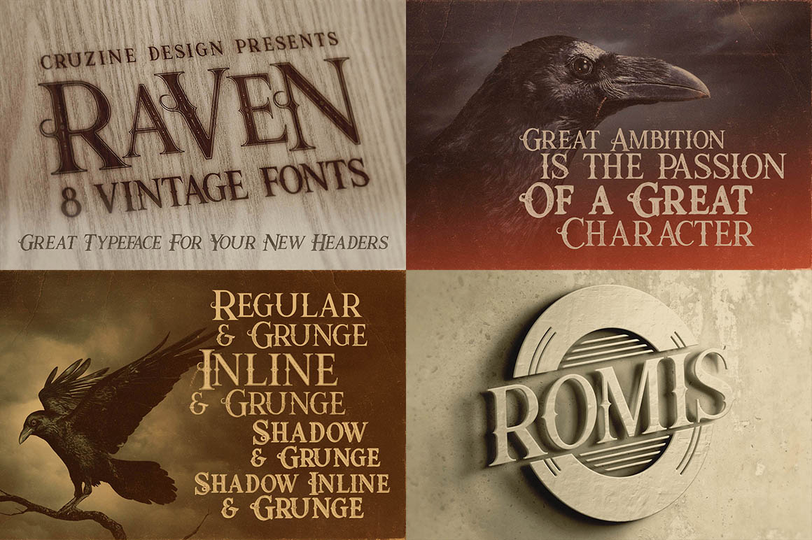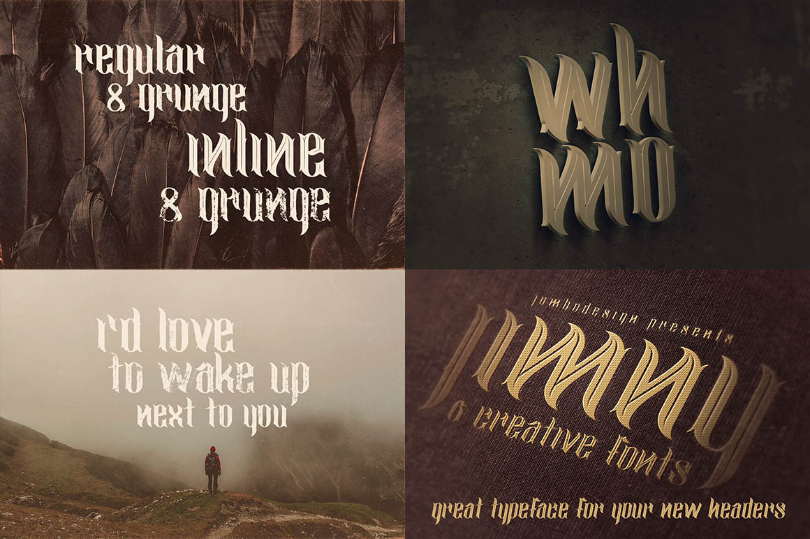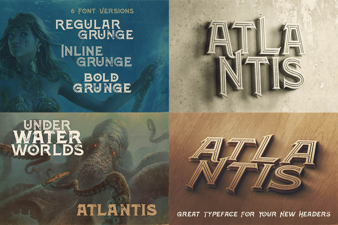 Unique vintage or fantasy style custom font with 6 styles: regular and grunge, inline & inline grunge, bold & bold grunge