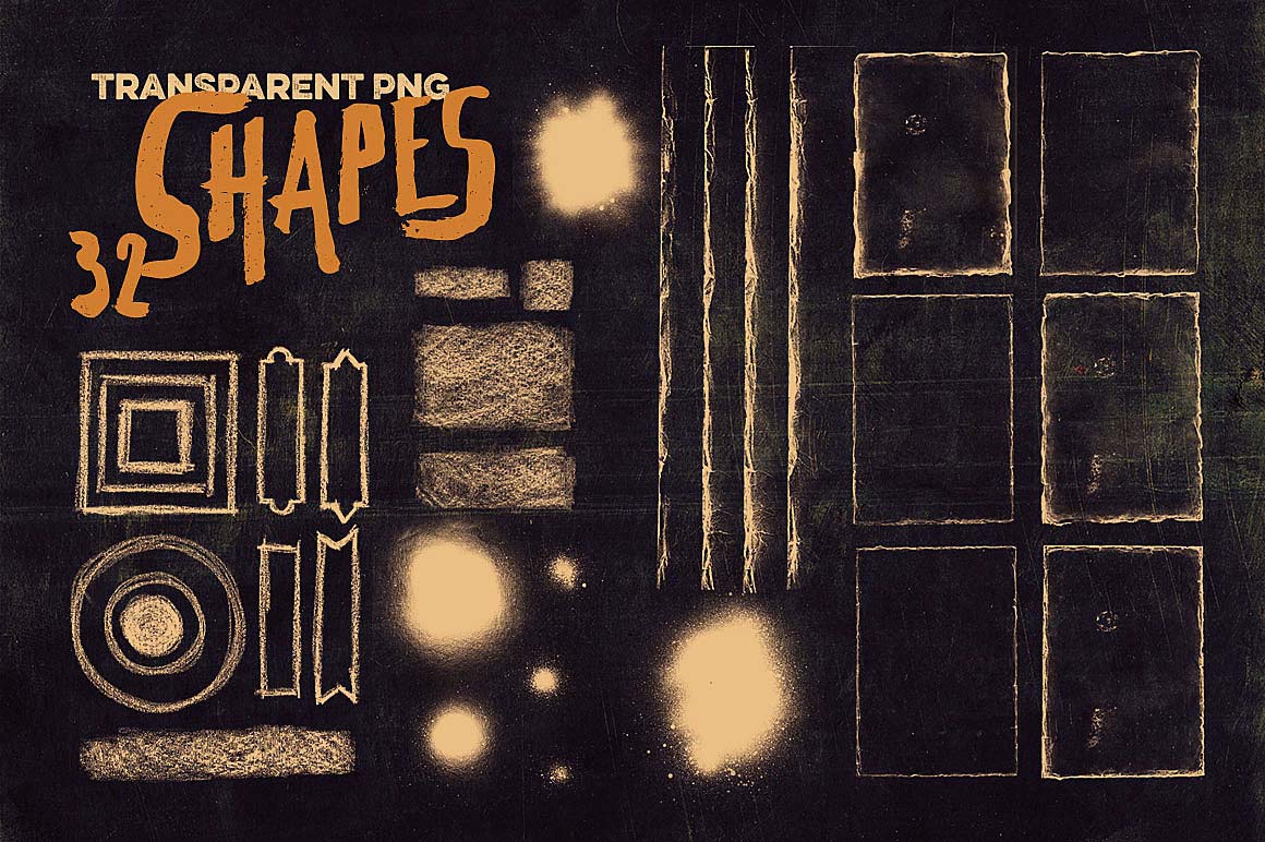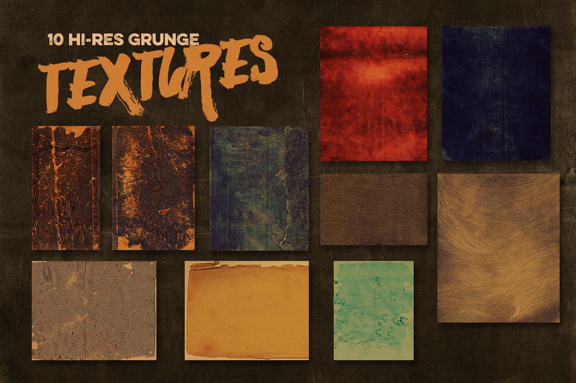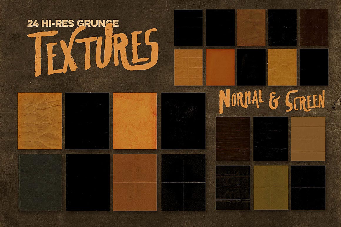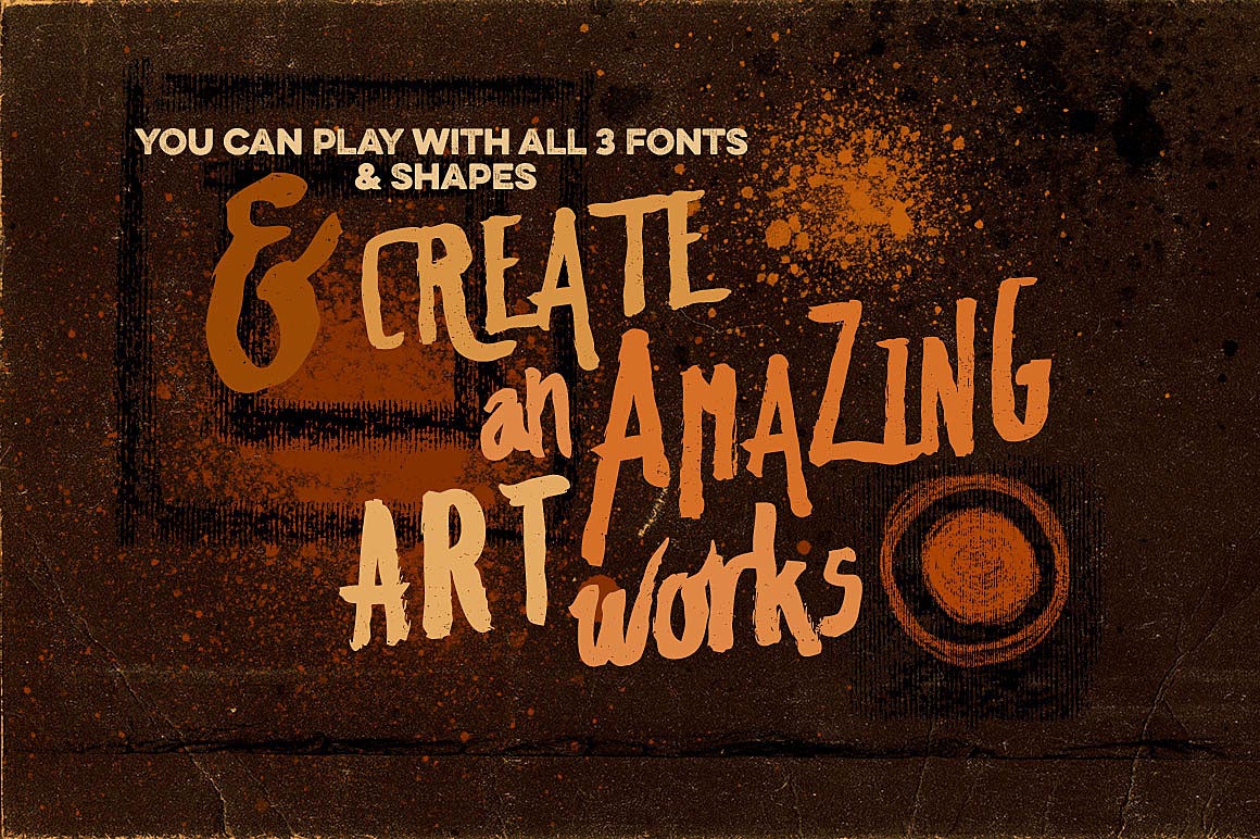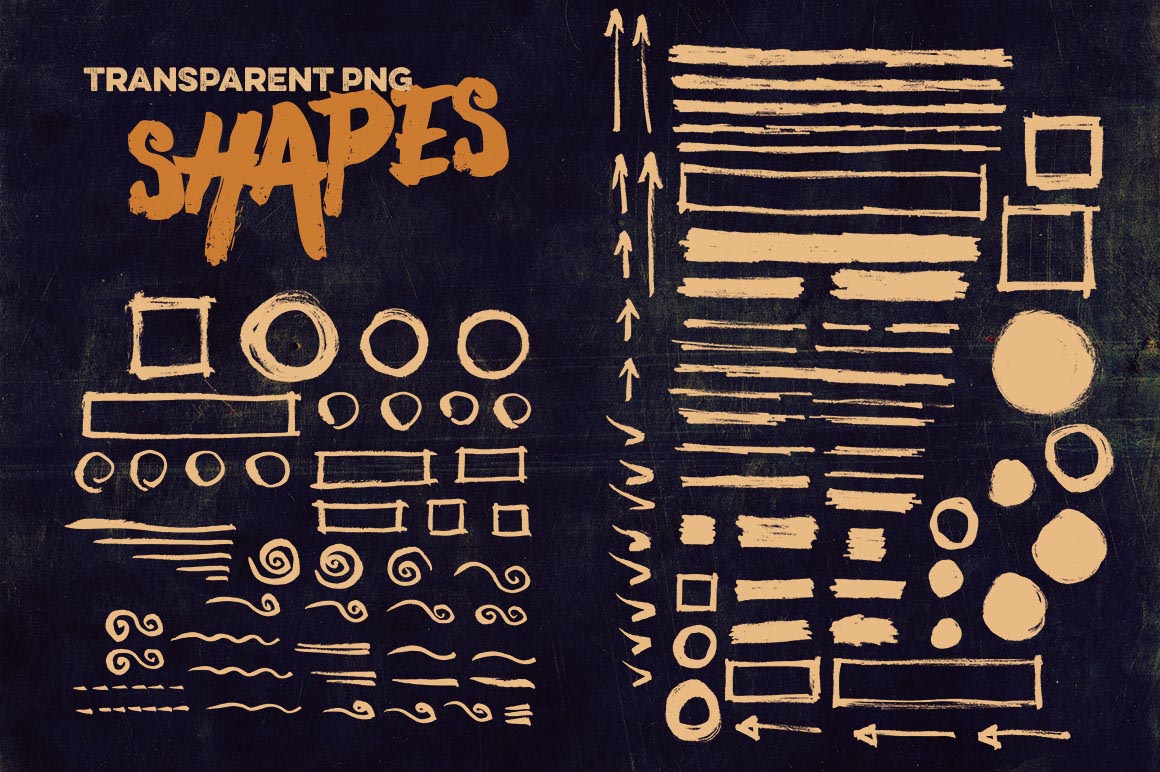 Creative grunge or brush typeface with: 3 font files (otf & ttf) – (vector lettering in AI), 32 transparent PNG shapes, 24 grunge hi-res textures.