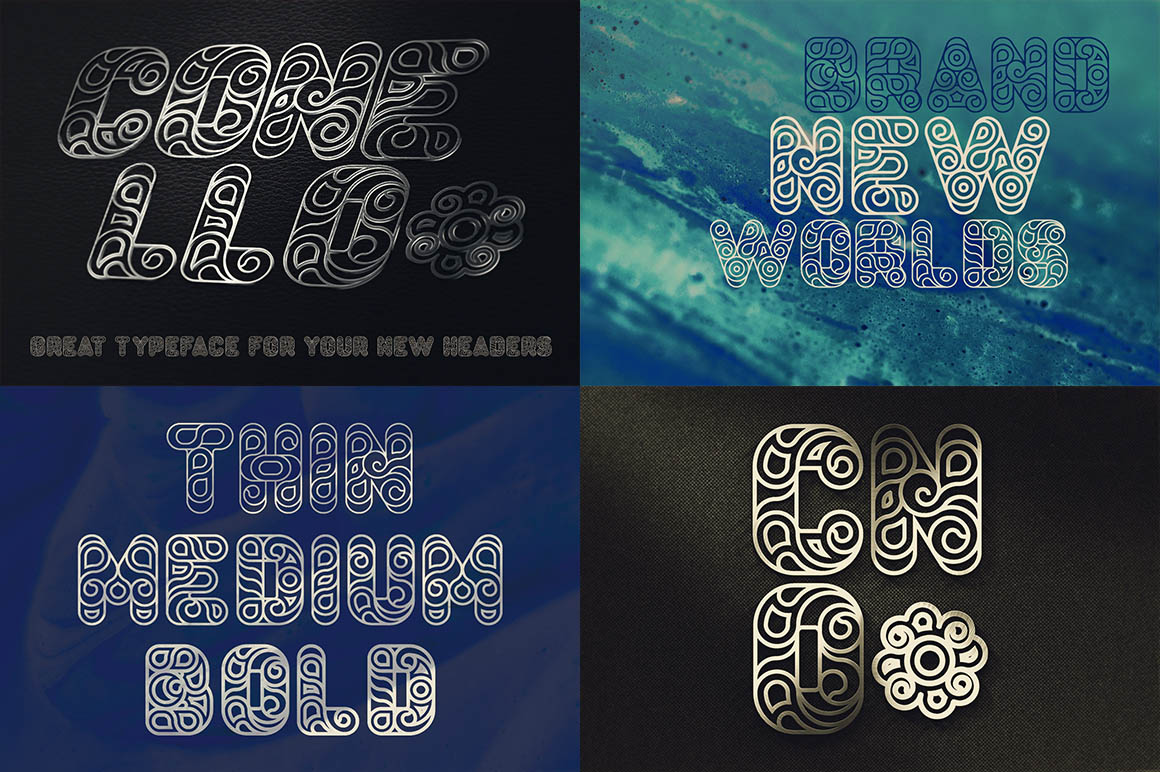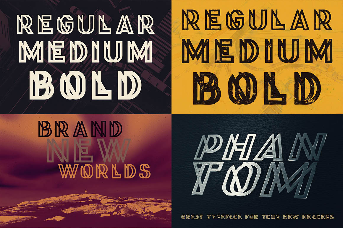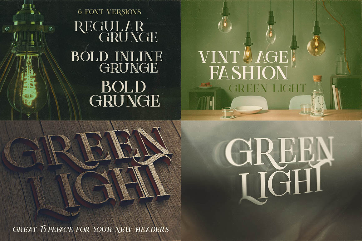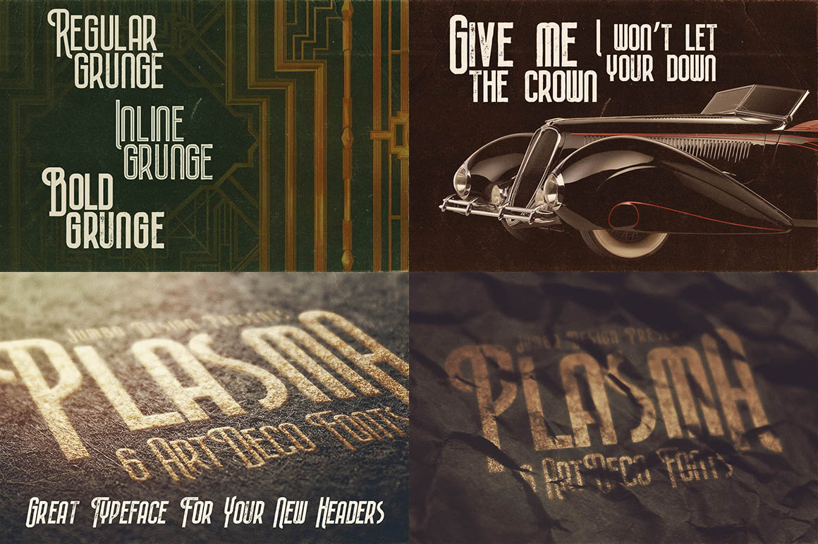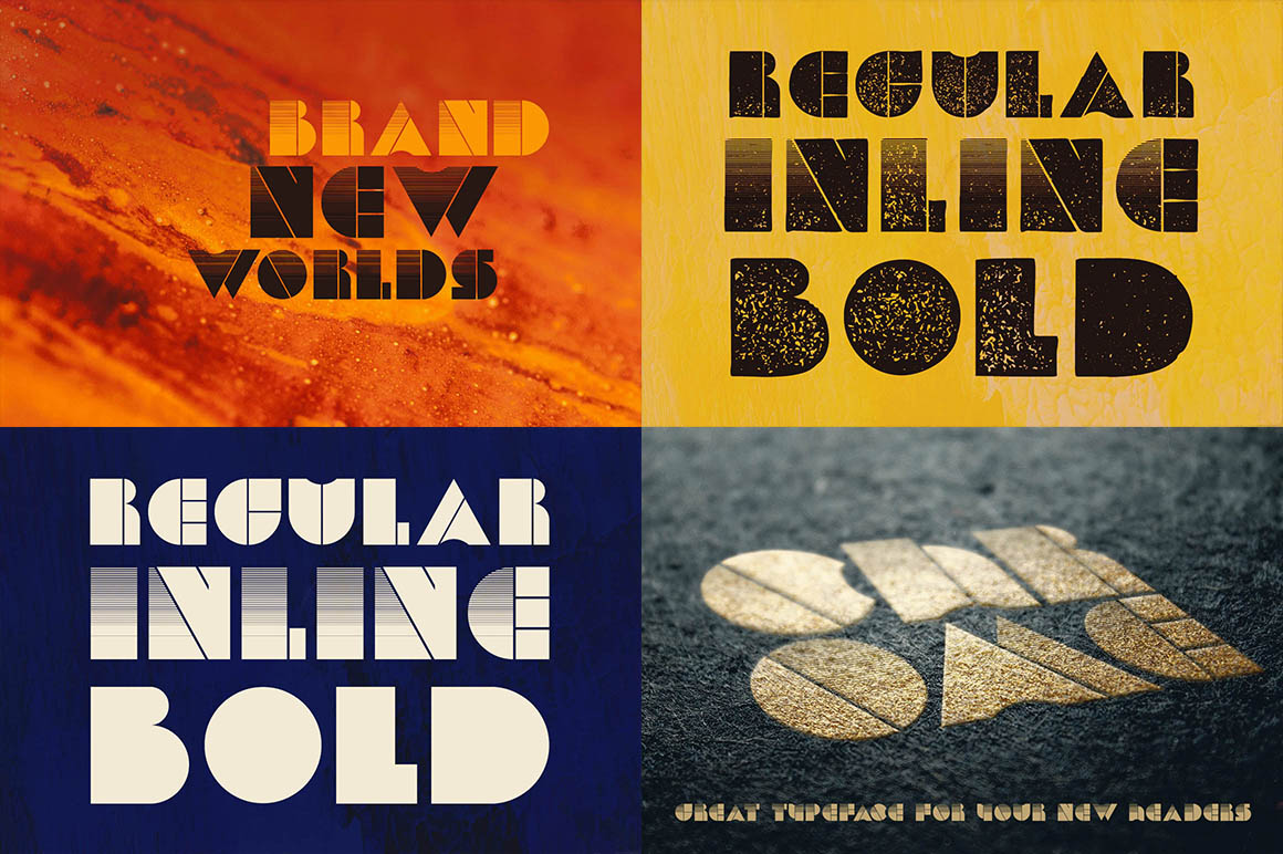 Unique artdeco, retro or vintage style custom font with 6 styles: regular and grunge, inline and inline grunge, bold and bold grunge.