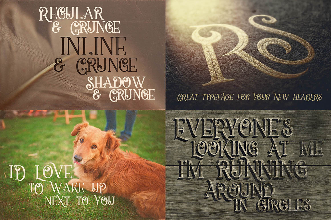 Modern and also vintage style custom font with 4 styles: regular and grunge, inline and inline grunge
