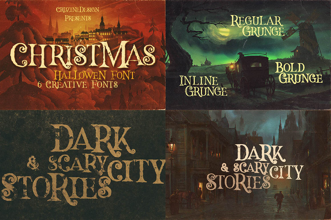 - 5 font files (otf & ttf) – regular & grunge, inline & inline grunge, outline