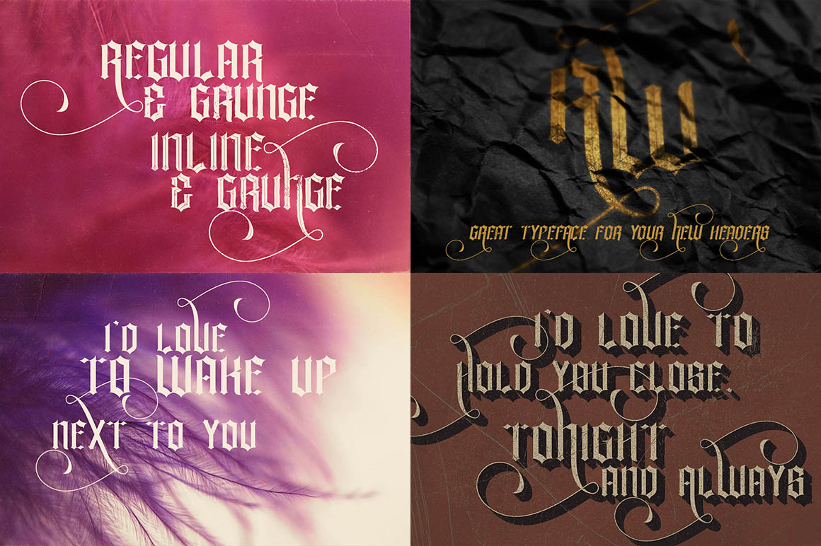 Unique vintage or fantasy style custom font with 4 styles: regular and grunge, inline and inline grunge