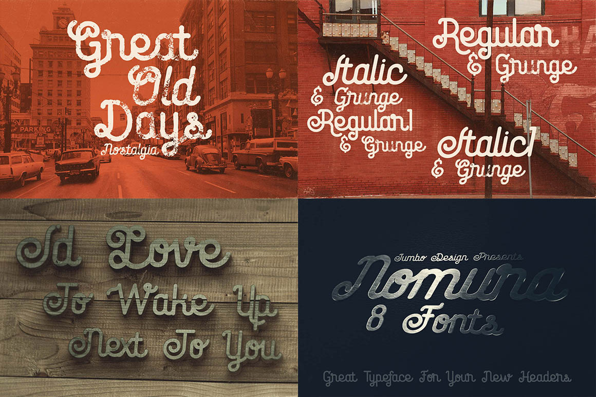 Cool script font for your new projects. Great for modern but also for retro/vintage projects! 4 font files (otf & ttf) – regular, grunge & regular version2, grunge version2.