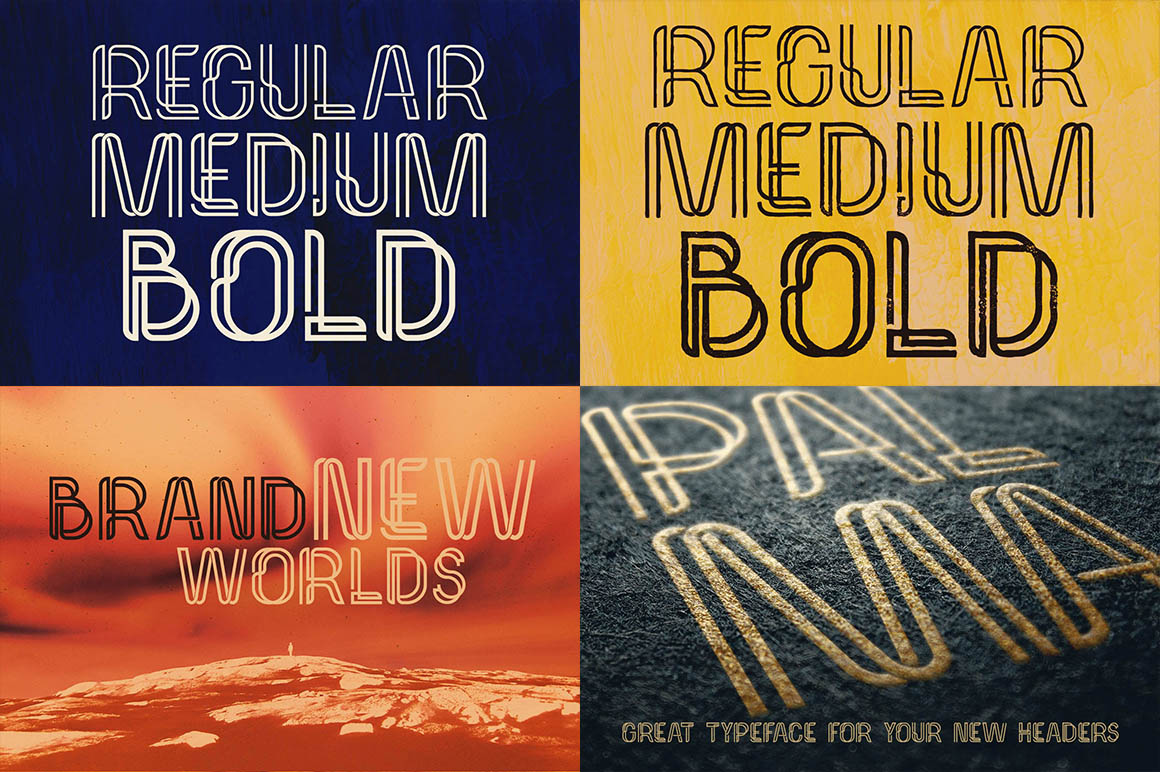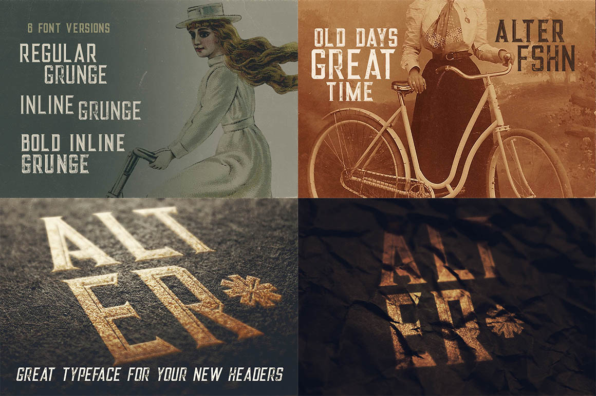 Unique vintage style custom font with 4 styles: regular and grunge, line & line grunge