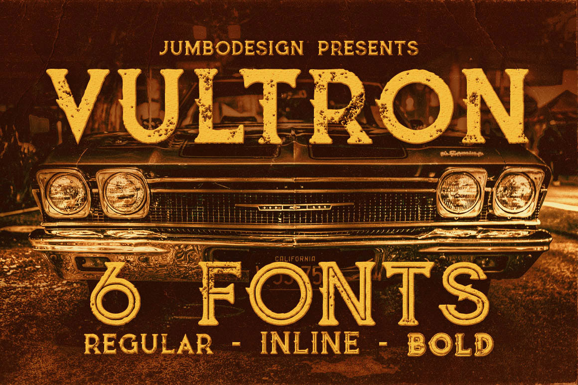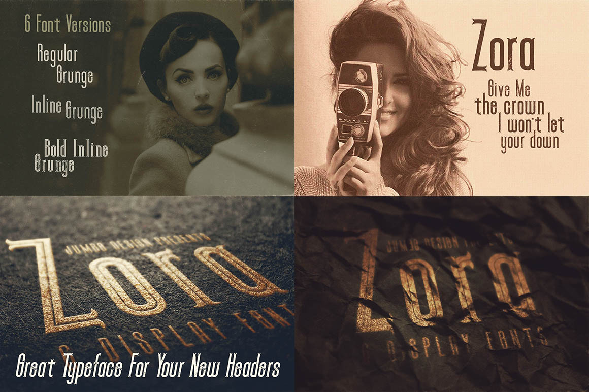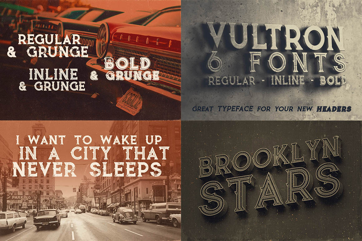 Unique retro or vintage style custom serif font with 6 styles: regular and grunge, bold inline and bold inline grunge, bold and bold grunge.
