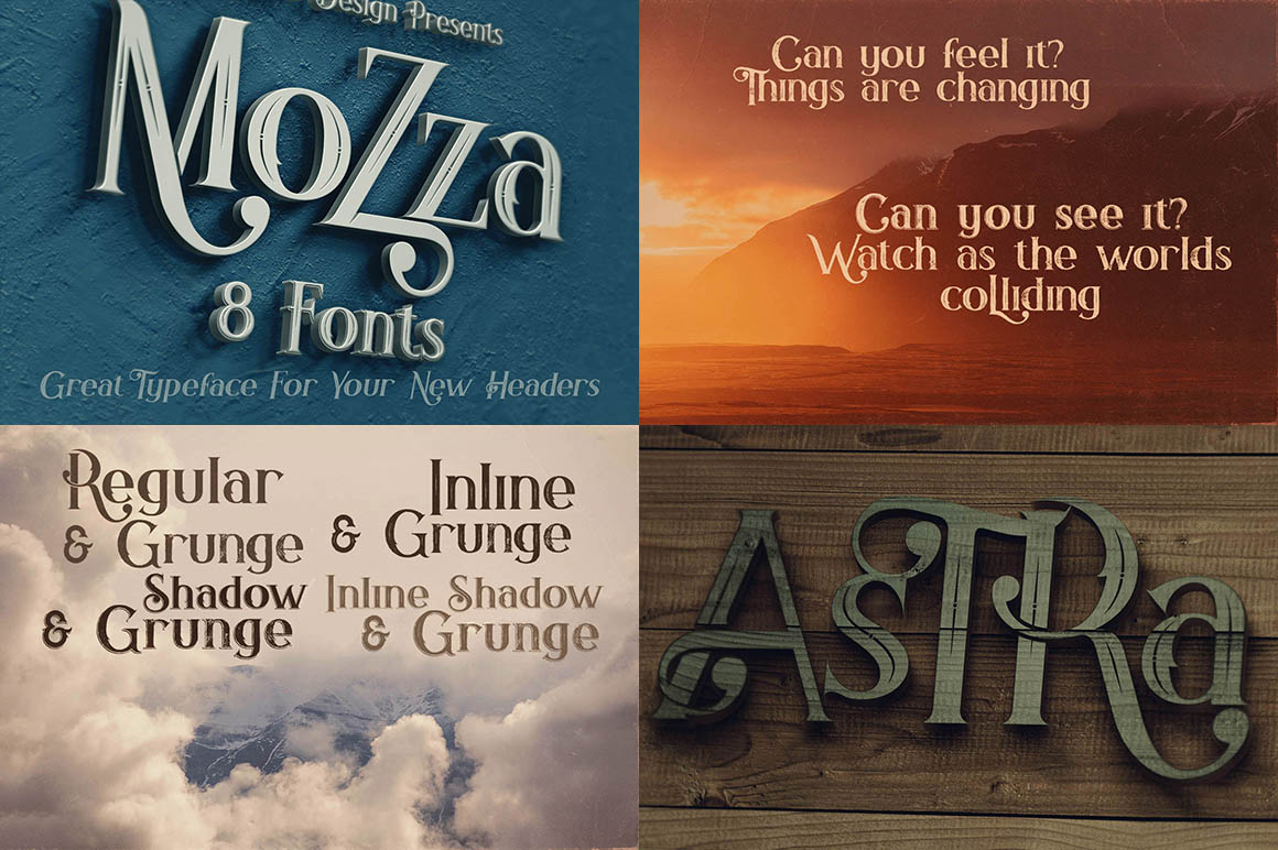 Unique retro or vintage style custom serif font with 6 styles: regular and grunge, inline and inline grunge, bold inline and bold inline grunge.