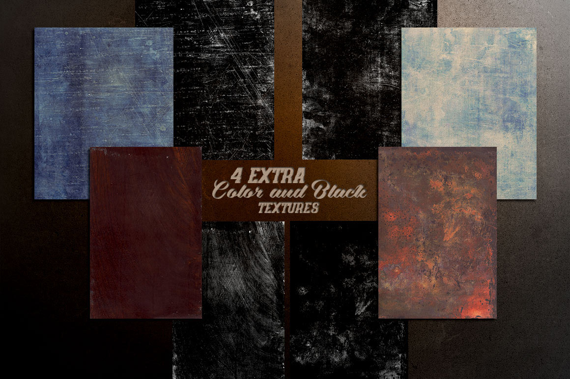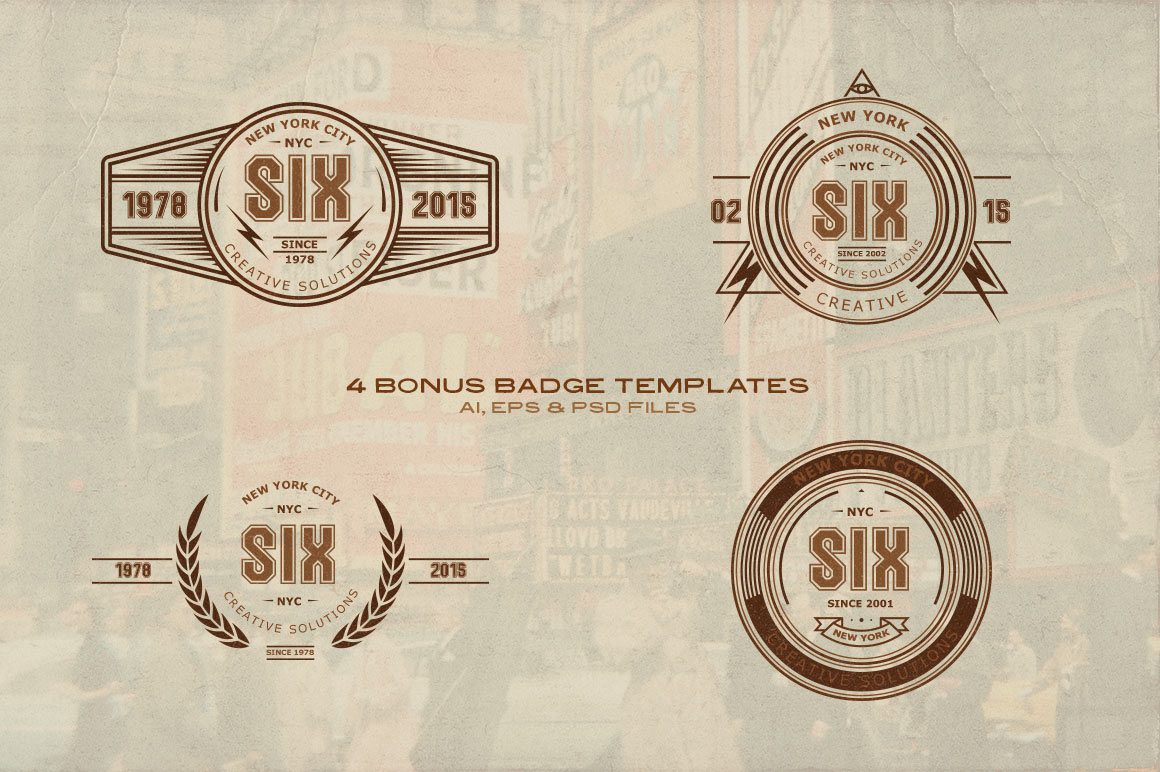Creative font with 2 styles: regular and grunge, TTF, OTF format and vector (ai), 4 logo/badge templates (ai, eps and psd files), 4 grunge textures (color and black versions).
