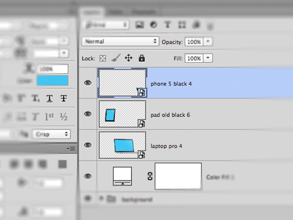When you use ready made showcases or generators. You will see just one smart object layer for each devices. If you have 4 device on your scene there are just 4 layers + background creator layer. So moving, scaling, rotating or applying any effect to them very easy.