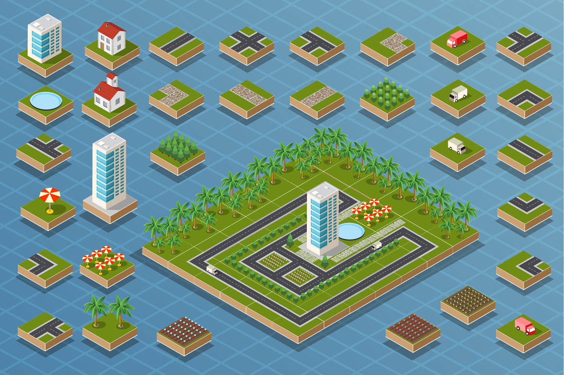 - Build your own city, maps or inforgaphics with more than 500 isometric vector objects!