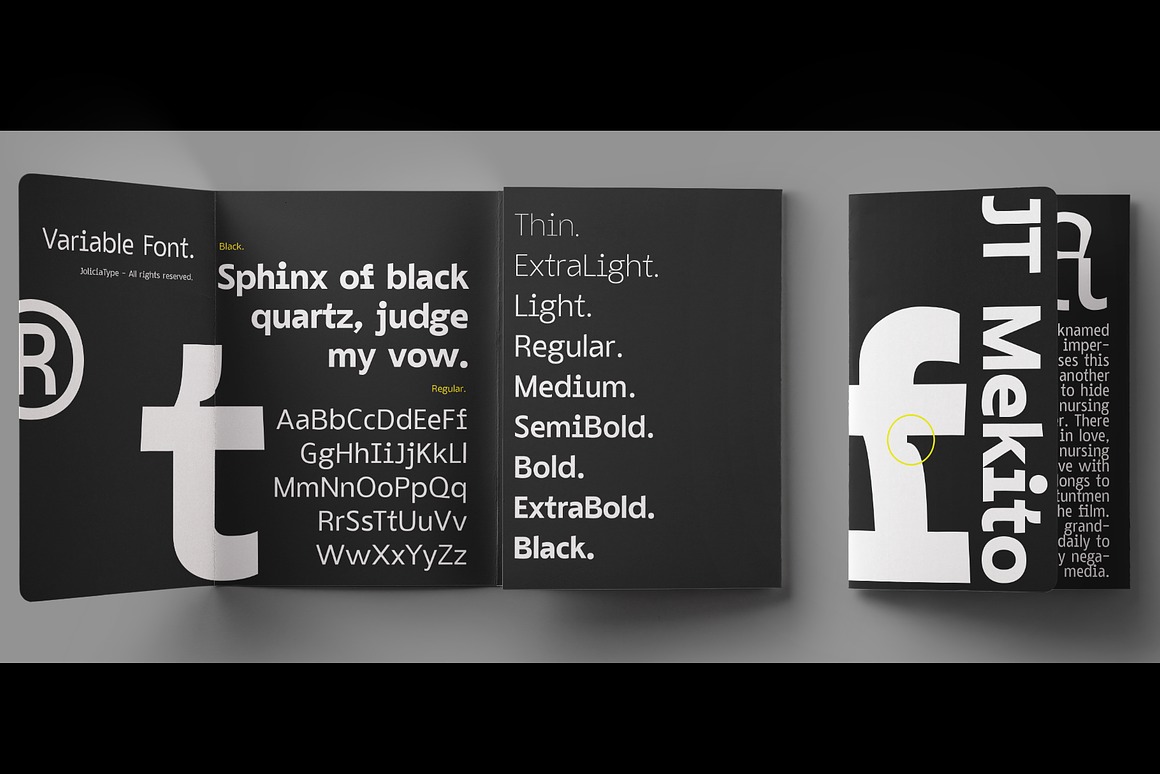 JT Mekito – 63 Fonts Family from Jolicia Type contains 63 multilingual fonts for your new modern or elegant projects! Variable font file is also included! (all 63 font styles in 1 font file). Don’t miss this trendy & sharp style branding font 😉
