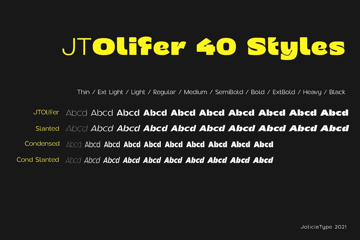 JT Olifer is family font of Jolicia Type designed by Laire Banyu Sandi Pawenang in October 2021, JT Olifer inspired by Modern Typography developed by us in our perspective, with a typeface detail in every corner we make more rounded, and give an inktrap accent to make unique impression special in every glyph, we really consider about aspect legibility, therefore we make family font amount 40 to assist the selection according to visual needs.