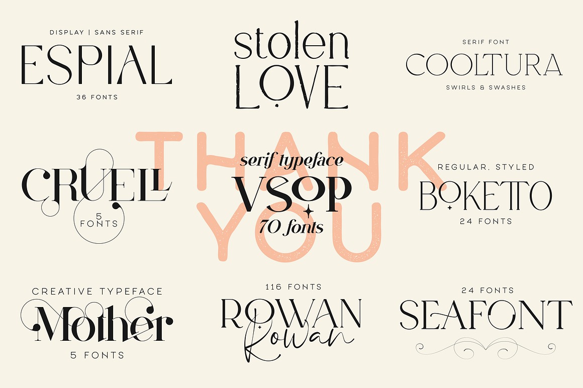 Espial Typeface (36 Fonts): Espial is a versatile typeface with 36 unique fonts that provide a wide range of options for your projects. From elegant scripts to modern sans-serifs, this font family offers diversity and creativity.